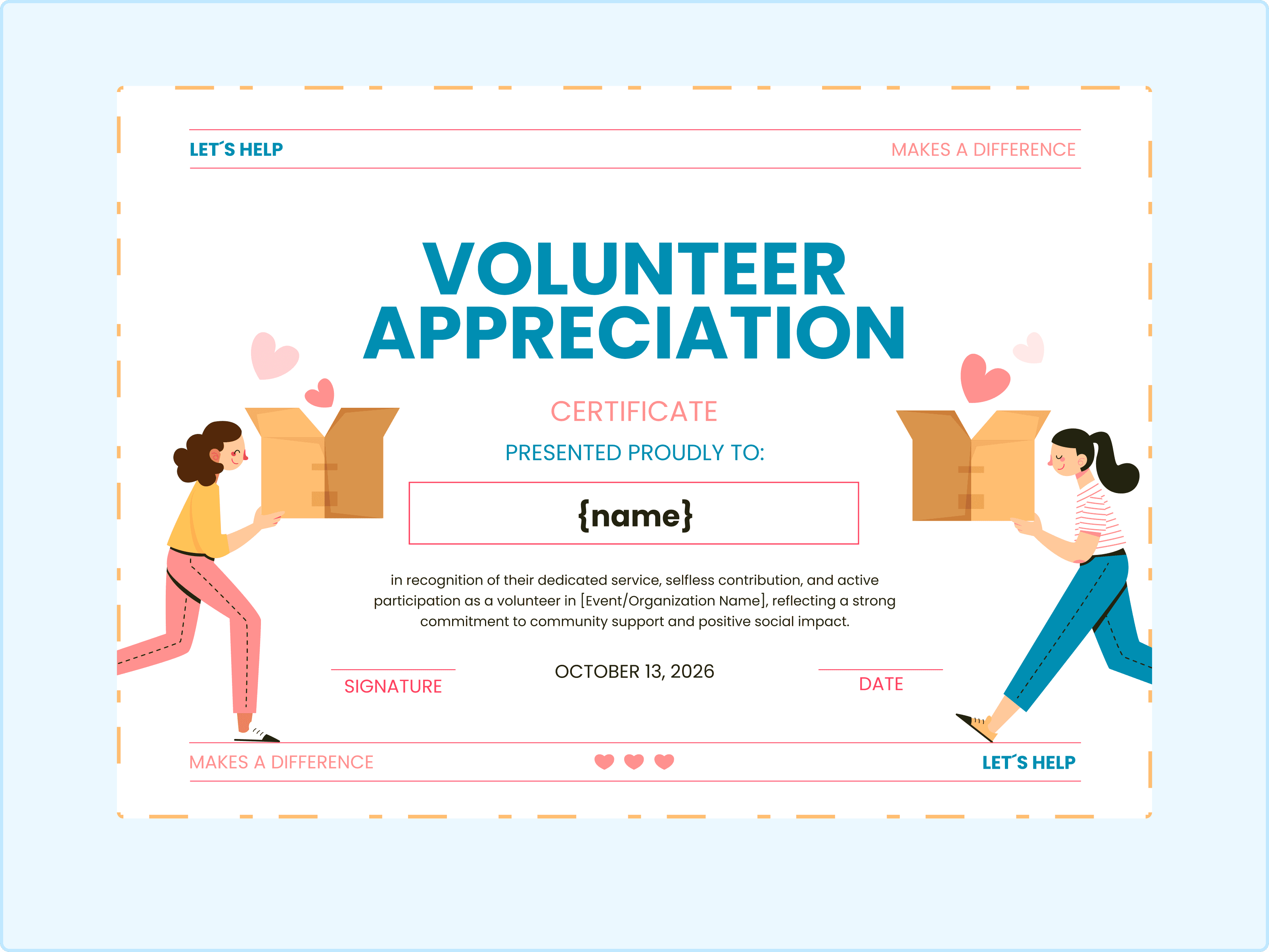 I absolutely adore this illustration of two volunteers carrying boxes. It literally depicts the work being done! It is lively, relatable, and celebrates the spirit of teamwork. This is the ultimate food bank volunteer certificate or donation drive award certificate. It visually represents the effort of sorting and packing, making the recipient feel seen for their hard physical work. Using a volunteer certificate template like this one can significantly boost morale.