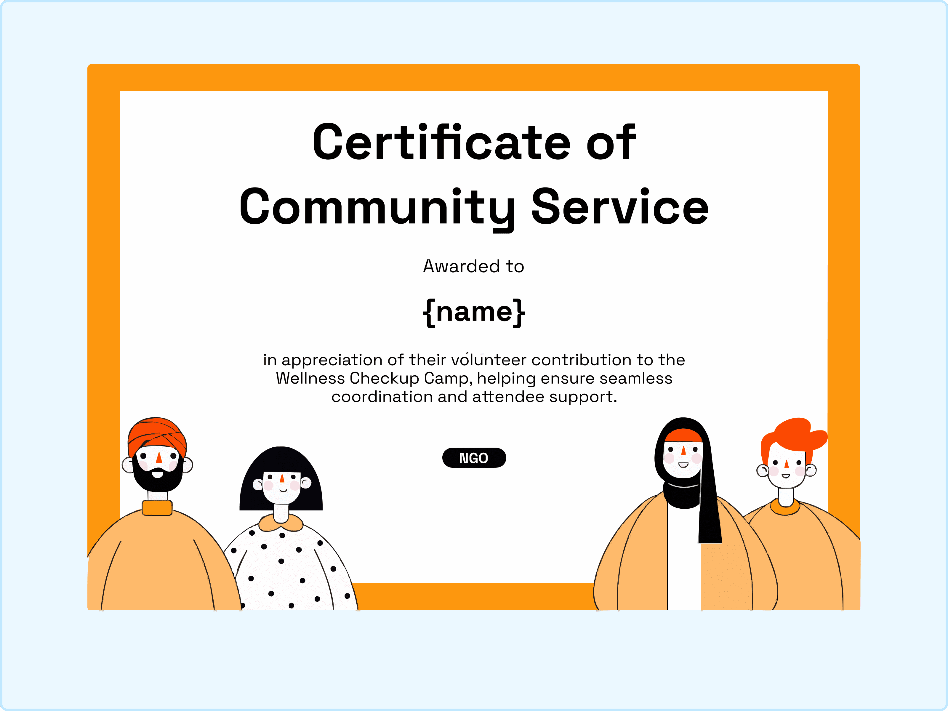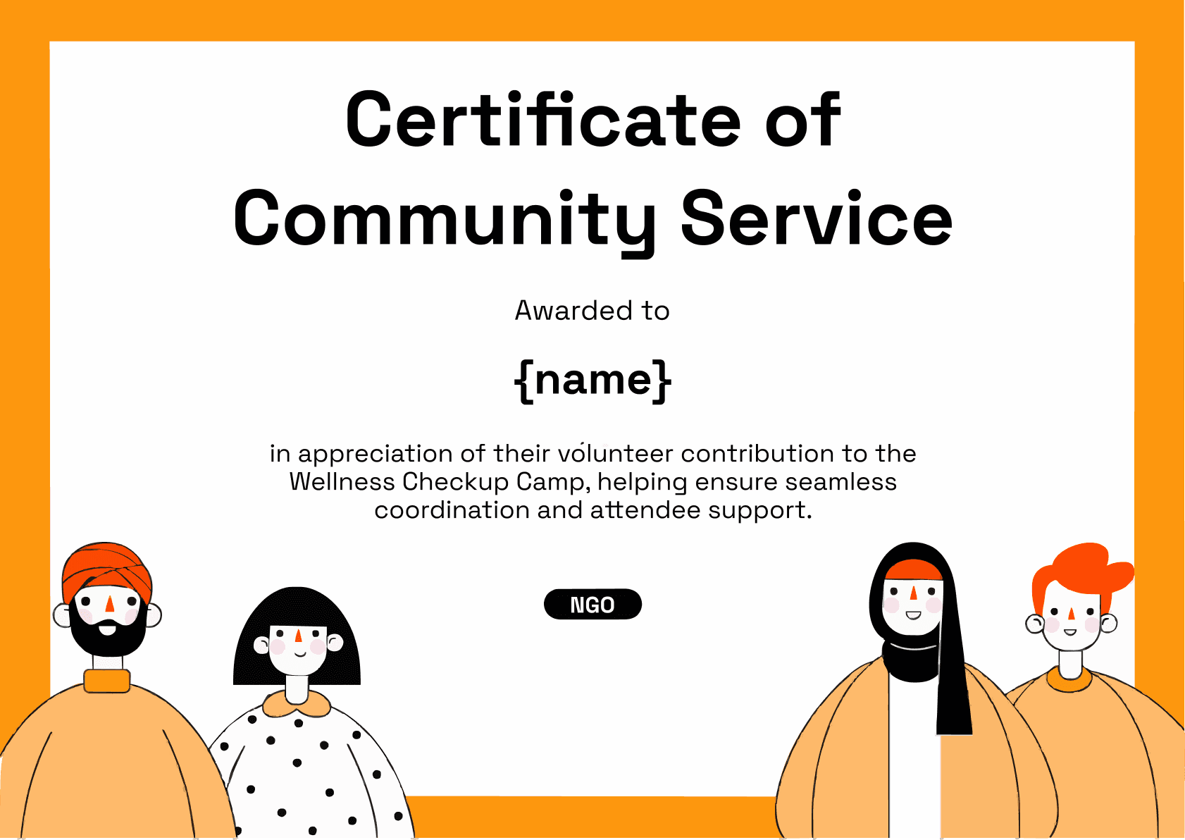 This template is all about togetherness. It features a bold orange border that makes the design pop immediately. My favorite part is the row of diverse characters illustrated at the bottom. It sends a wonderful message of inclusivity and unity. This is the perfect community service certificate for neighborhood initiatives, NGO drives, or public health campaigns where you want to celebrate the collective effort of the team. It feels warm, grounded, and very human.