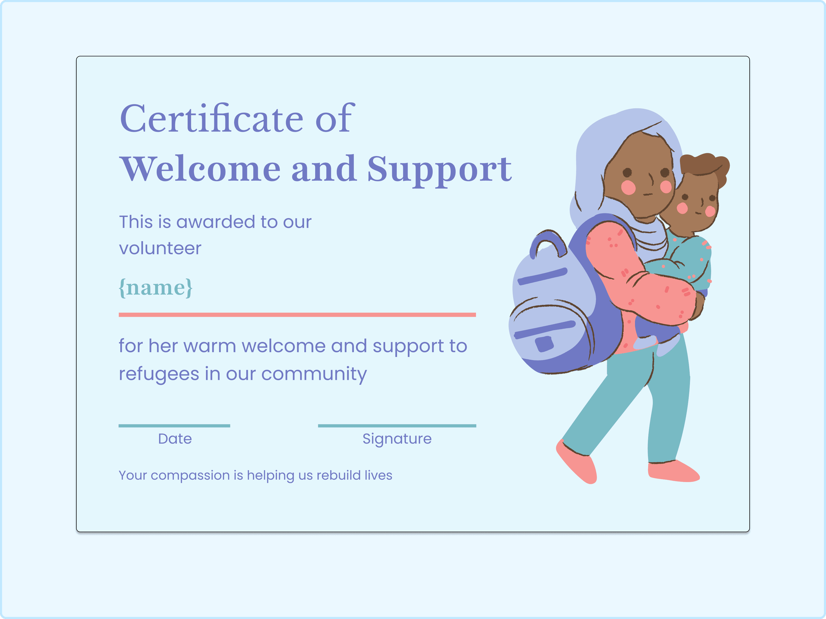 This is a deeply touching design. It features a beautiful illustration of a volunteer carrying a child, symbolizing care and protection. The title "Certificate of Welcome and Support" sets a very specific and meaningful tone. This is the perfect refugee support certificate or humanitarian aid award. It acknowledges the emotional weight and importance of helping families rebuild their lives. Ensure the recipient's name is prominently displayed.