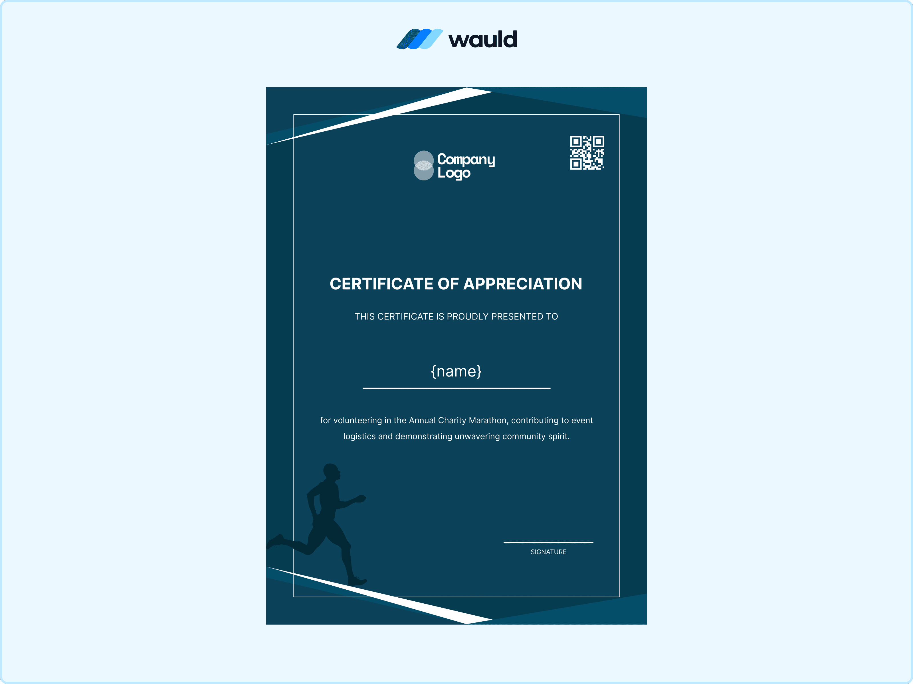 For sports events and charity runs, this is your go-to design. The dark blue background creates a striking contrast with the white text, and the silhouette of the runner in the corner sets the context immediately. It looks sleek and athletic. This charity marathon certificate is perfect for event logistics teams, water station volunteers, or race marshals. It feels energetic and professional. Don't forget to edit the recipient's name to personalize the certificate.
