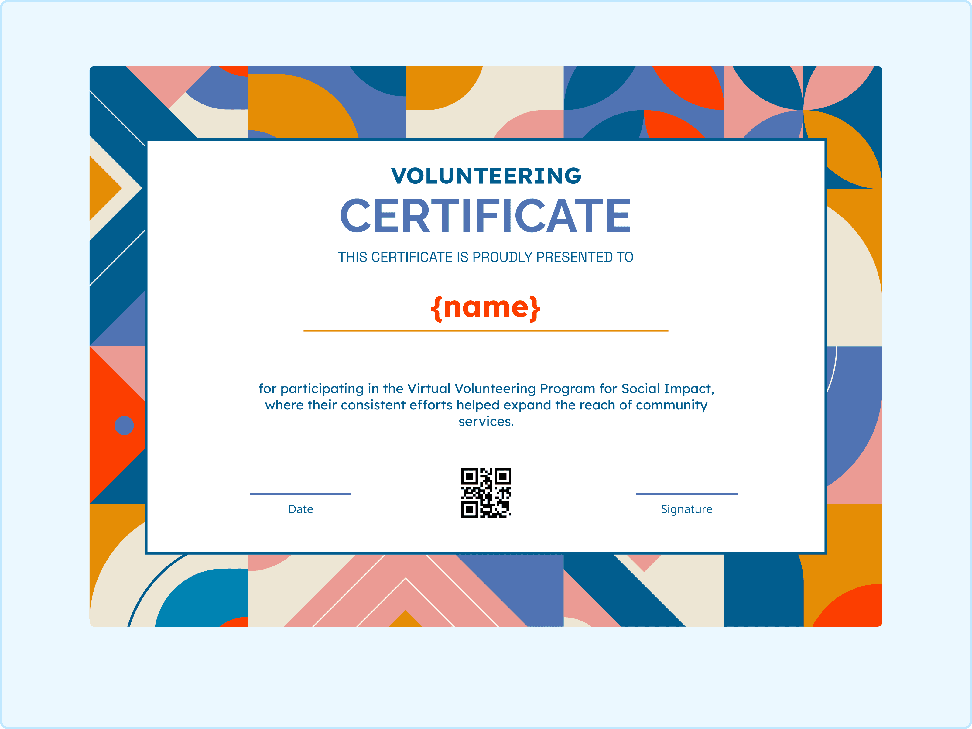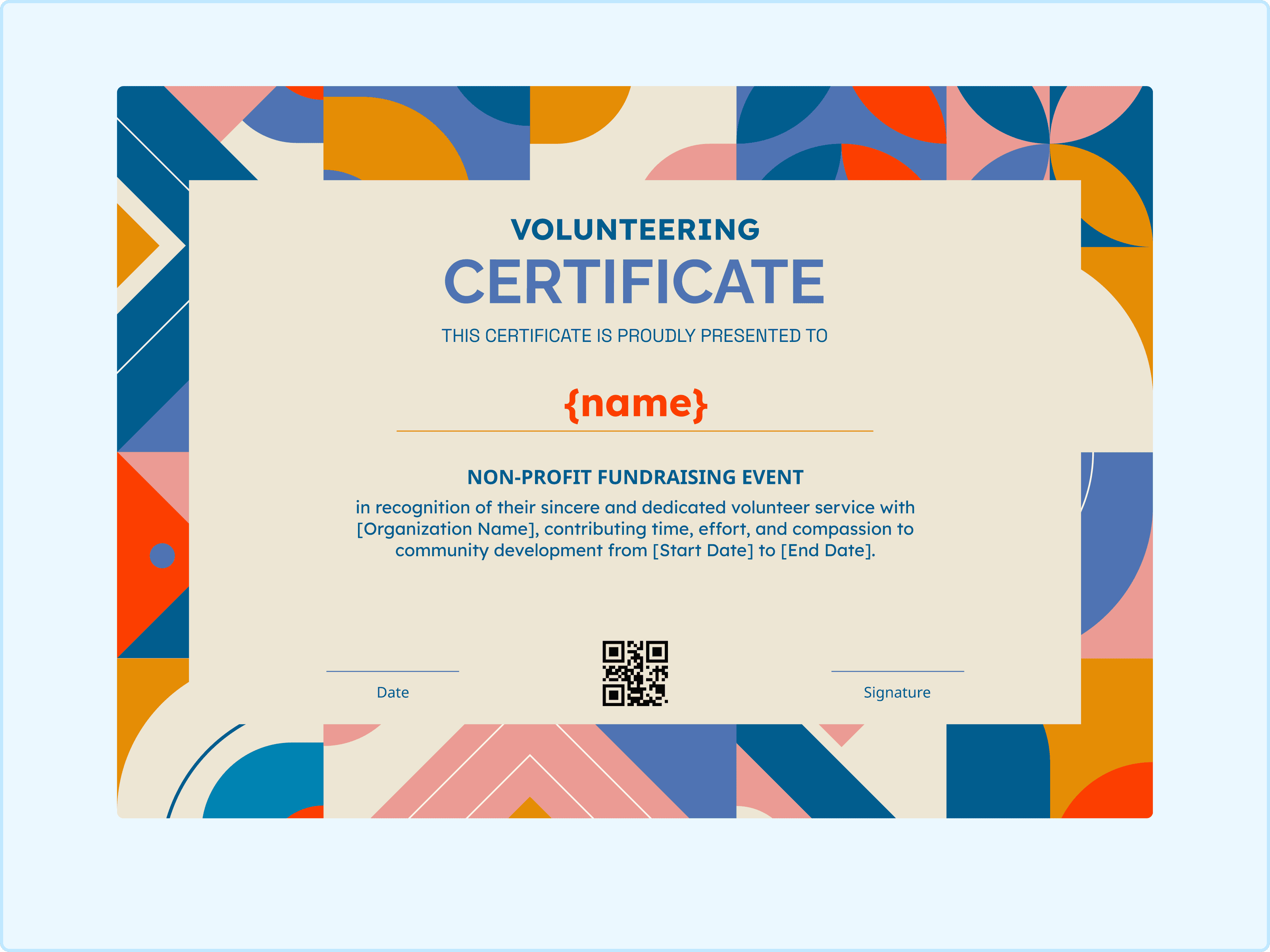 If you like bold patterns, you will love this one. It features a chunky geometric border in orange, blue, and cream that gives off a cool retro vibe. It feels sturdy and substantial. This is a great non-profit fundraising certificate for organizations that want to look established but modern. It frames the QR code nicely at the bottom, making verification easy. Download a free certificate template like this today!