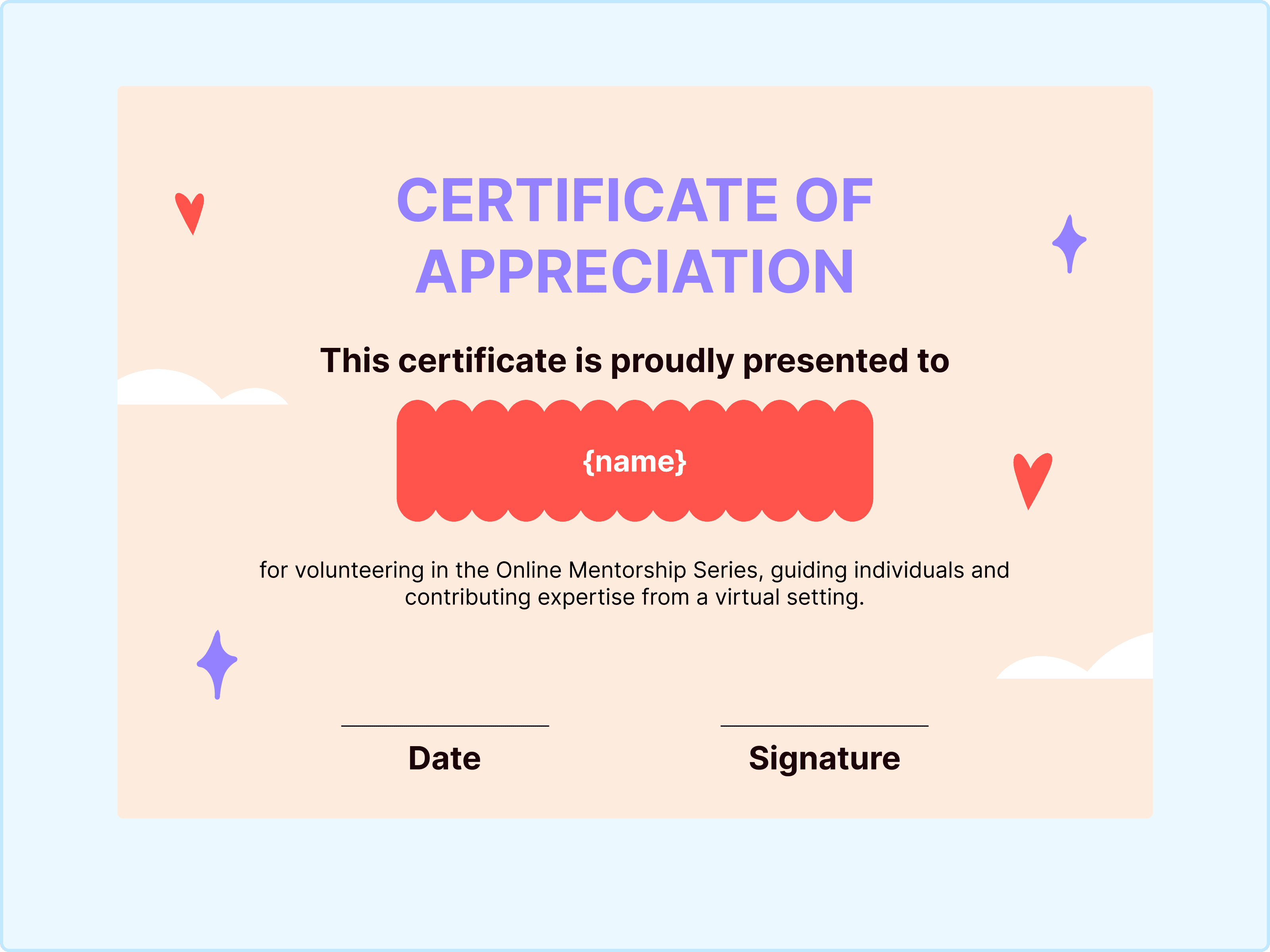 This certificate template is all about love and warmth. It features a bold red wavy shape right in the center that immediately grabs your attention. I really like the floating hearts and sparkles in the background. They make the certificate design template feel very genuine and heartfelt. This is a fantastic choice for virtual mentorship programs or care-based volunteering roles where emotional support is just as important as the practical work. It tells the volunteer that they are truly the "heart" of the mission. The layout makes it so that the viewer's eye will immediately be drawn to the center.