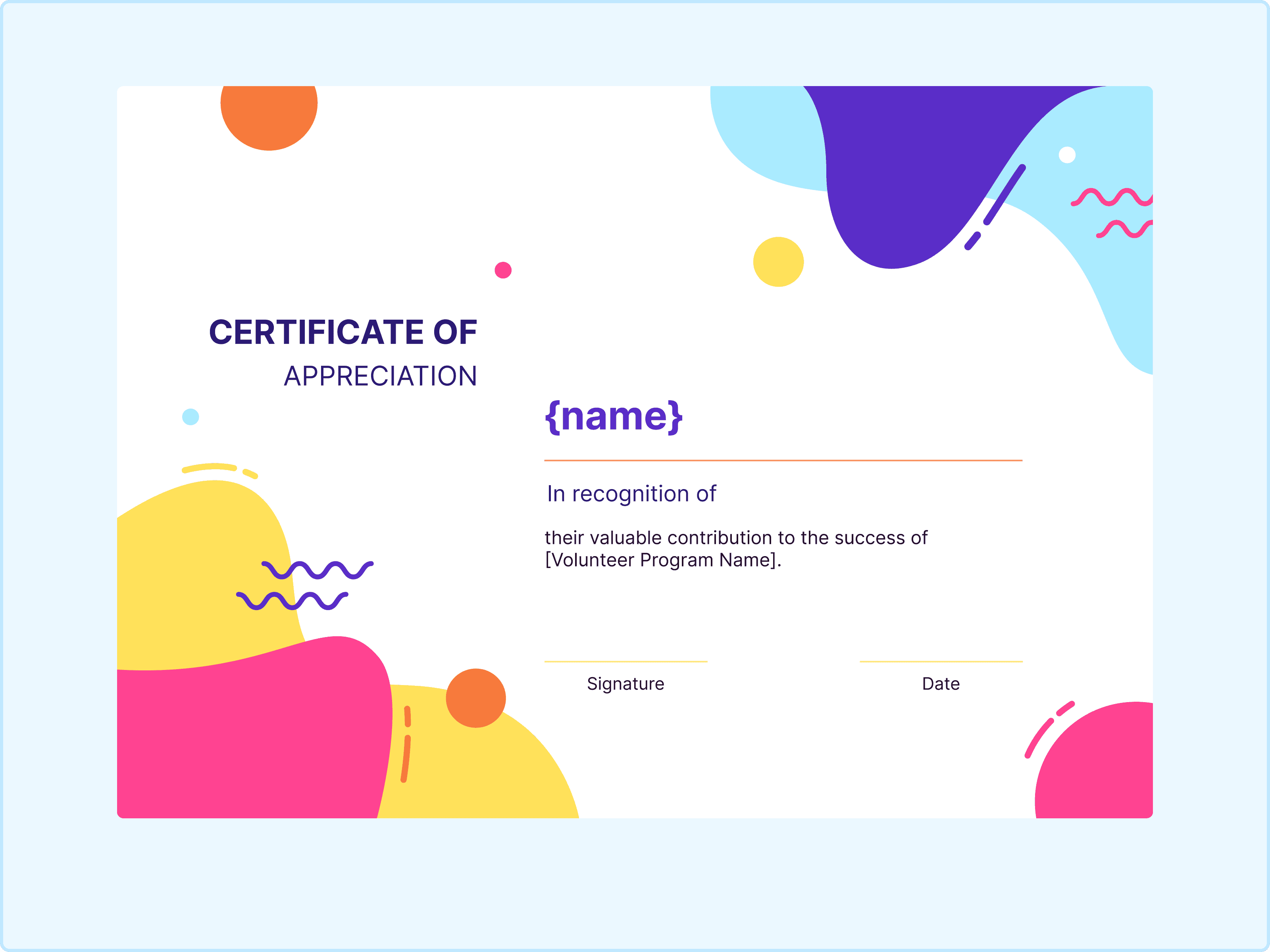 This certificate design is fun and free-flowing. It uses abstract liquid shapes in bright pink, yellow, and blue to create a frame that feels very dynamic. It is not rigid at all. I think this works beautifully for creative workshops, art program volunteers, or any role where flexibility and creativity are key assets. It feels fresh and youthful. This printable certificate is perfect for showing appreciation.