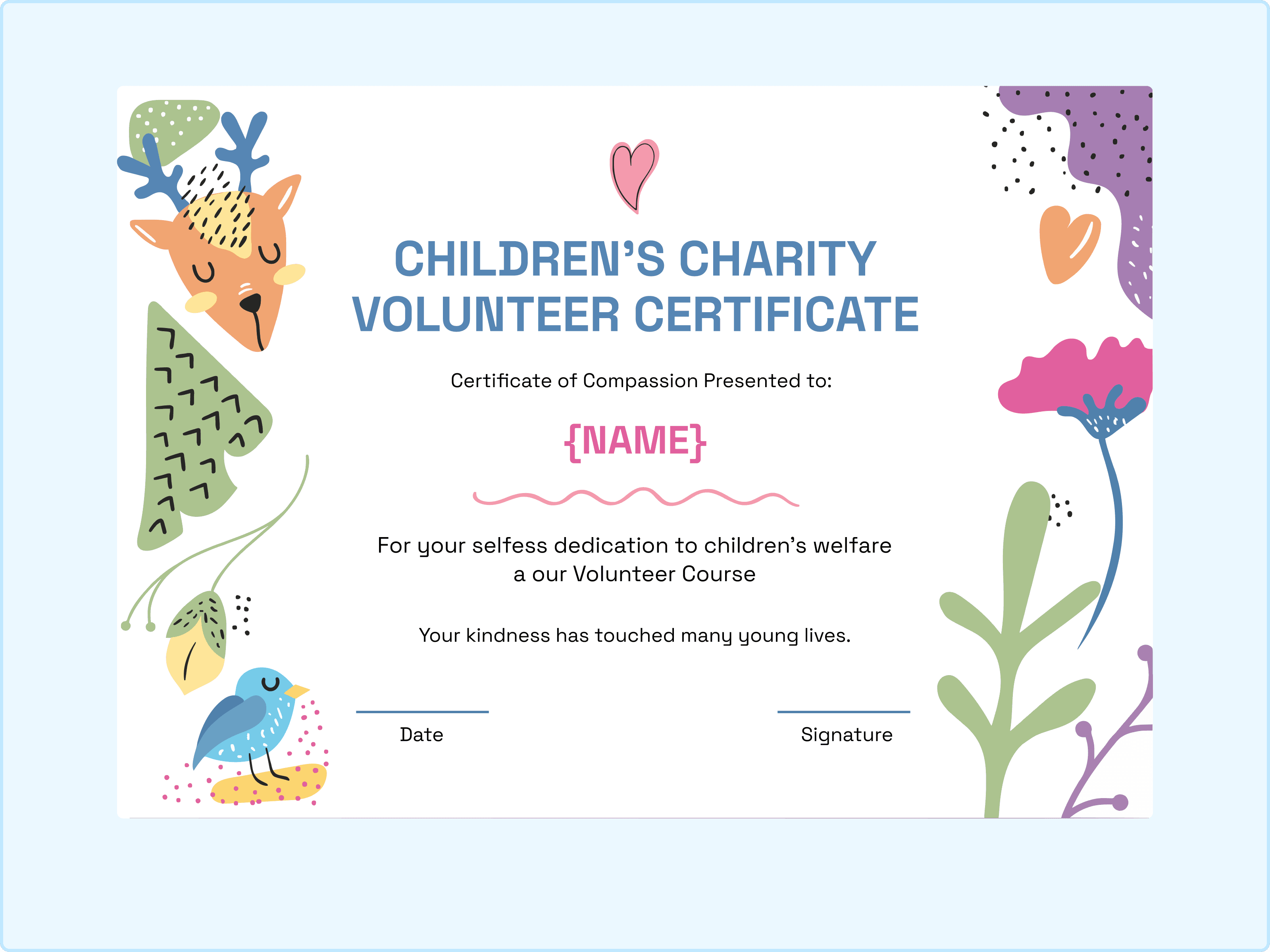 This is easily the cutest certificate template in the collection. With the adorable deer, bluebird, and whimsical plants, it looks like a page out of a storybook. It is incredibly sweet. I would suggest using this for children’s charity volunteers, storytelling sessions at libraries, or pediatric hospital volunteers. It captures the innocence and joy of working with kids perfectly. Ensure the font is easy to read and matches the playful theme.