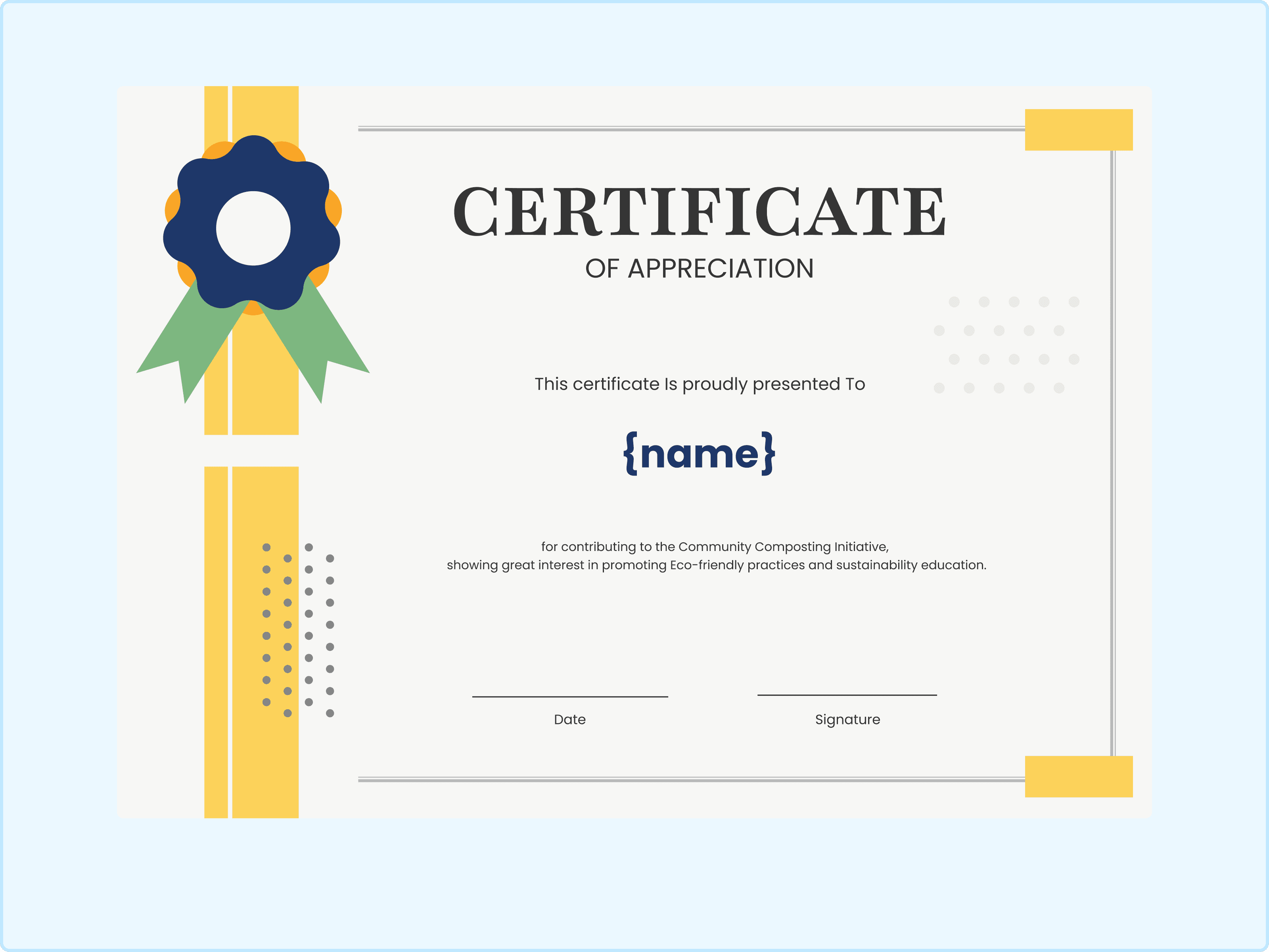 This certificate template takes the classic "award ribbon" concept and gives it a modern update. The big blue and green rosette on the yellow stripe screams "winner" without looking old-fashioned. I like the use of the dotted pattern in the background, which adds a bit of texture. This is a solid, versatile choice for community composting initiatives or sustainability education awards. Make it a printable certificate and award it today.