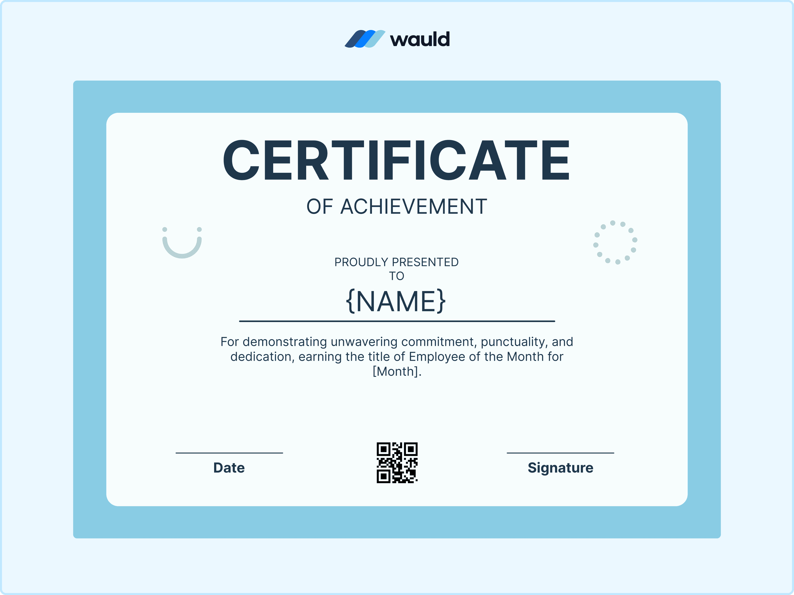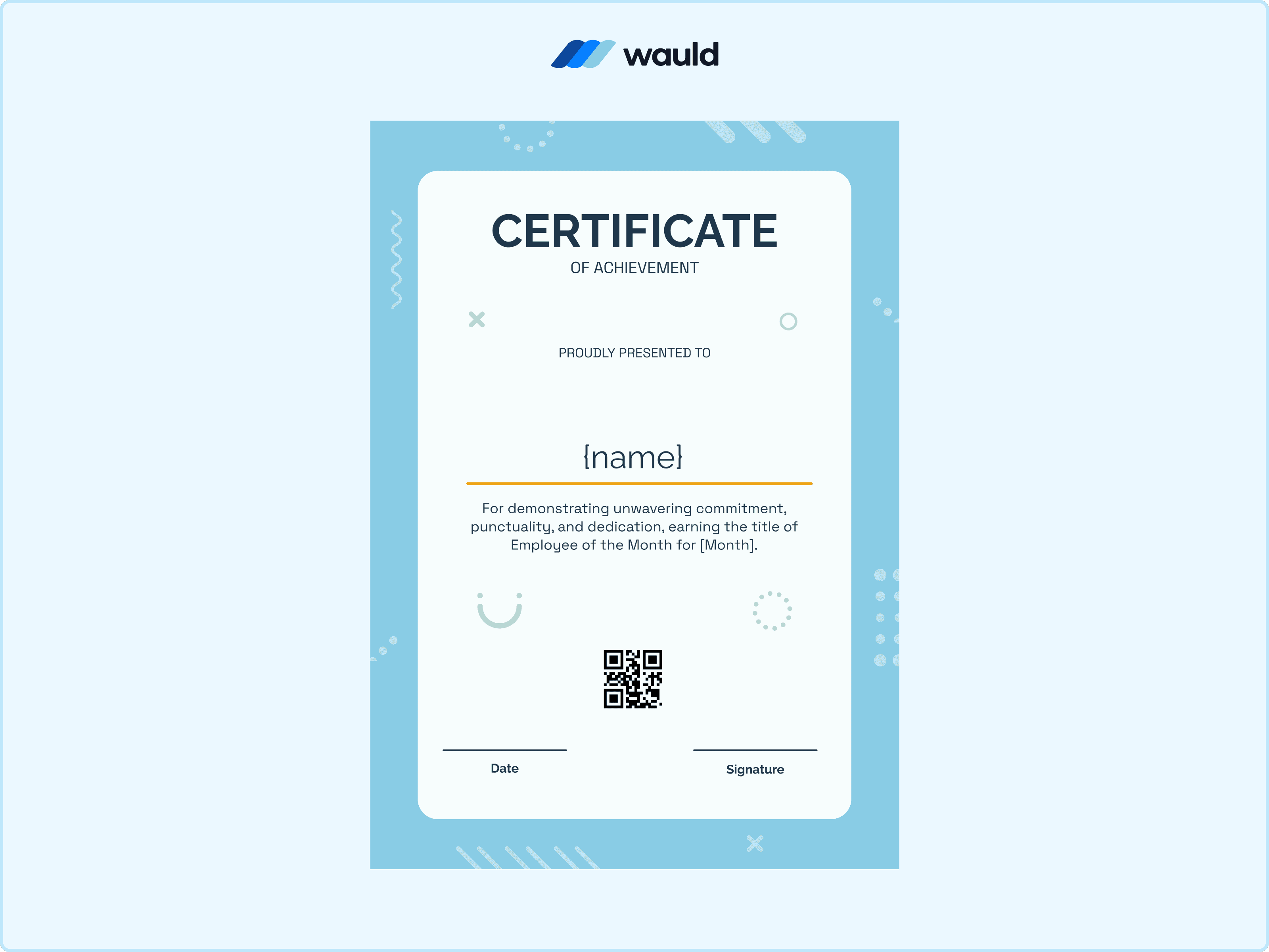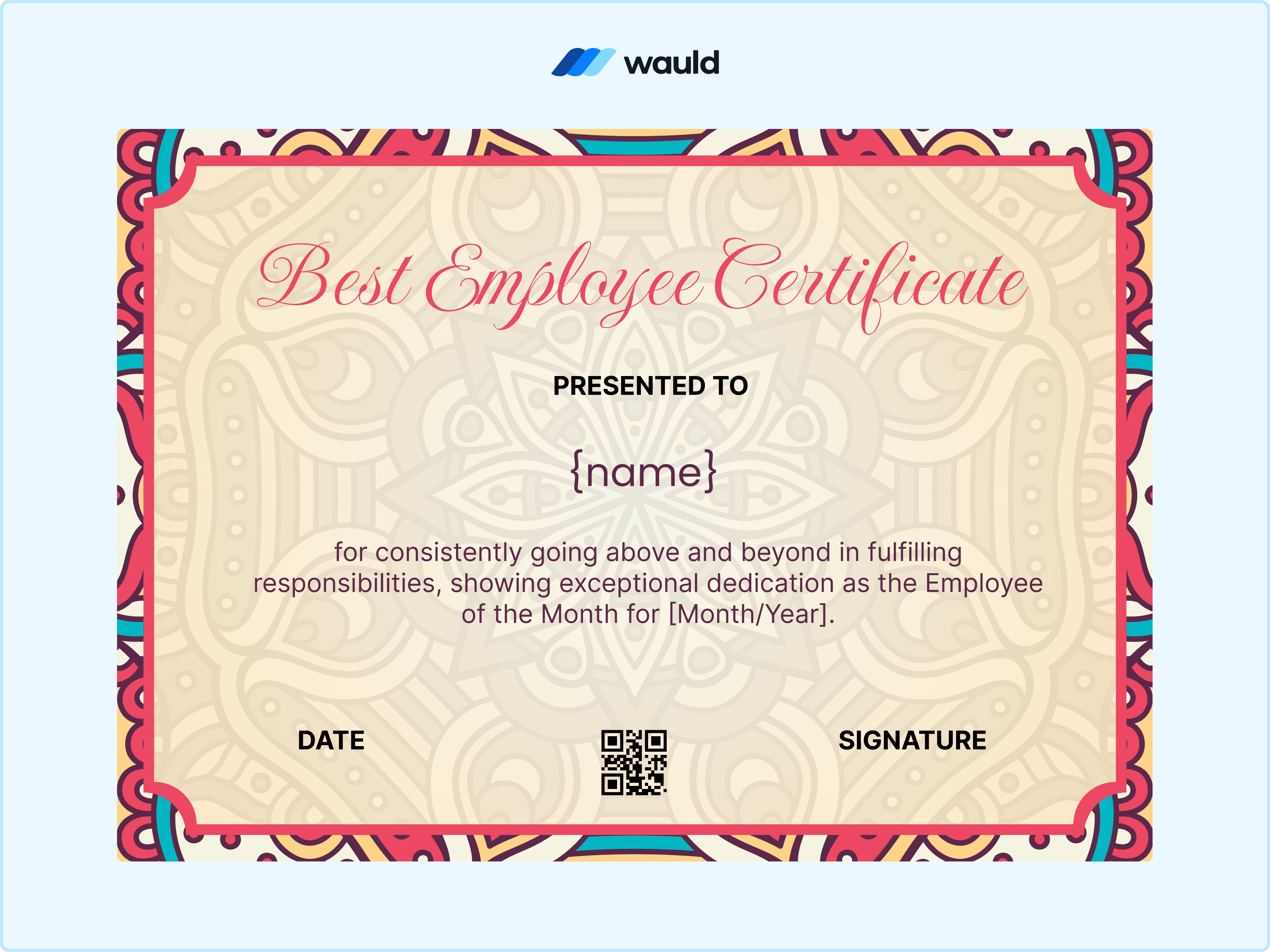 With its detailed patterns and classic styling, this certificate design feels more like a celebration than a routine award. It carries a sense of pride that looks just as good framed as it does shared online. As an Employee of the Month award, adding a QR code through Wauld makes the recognition feel complete and verifiable.