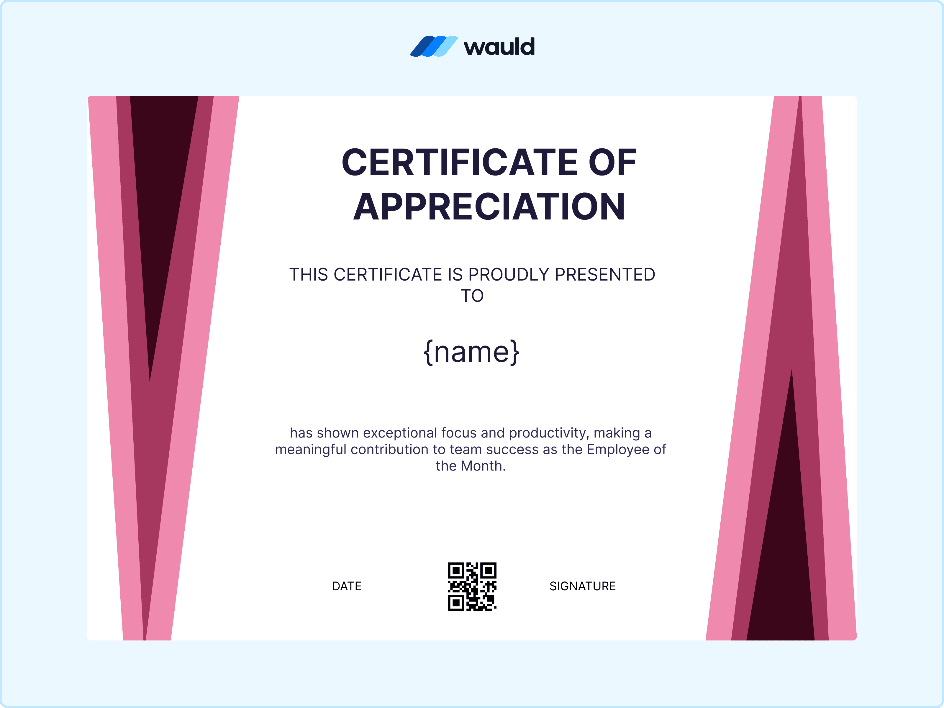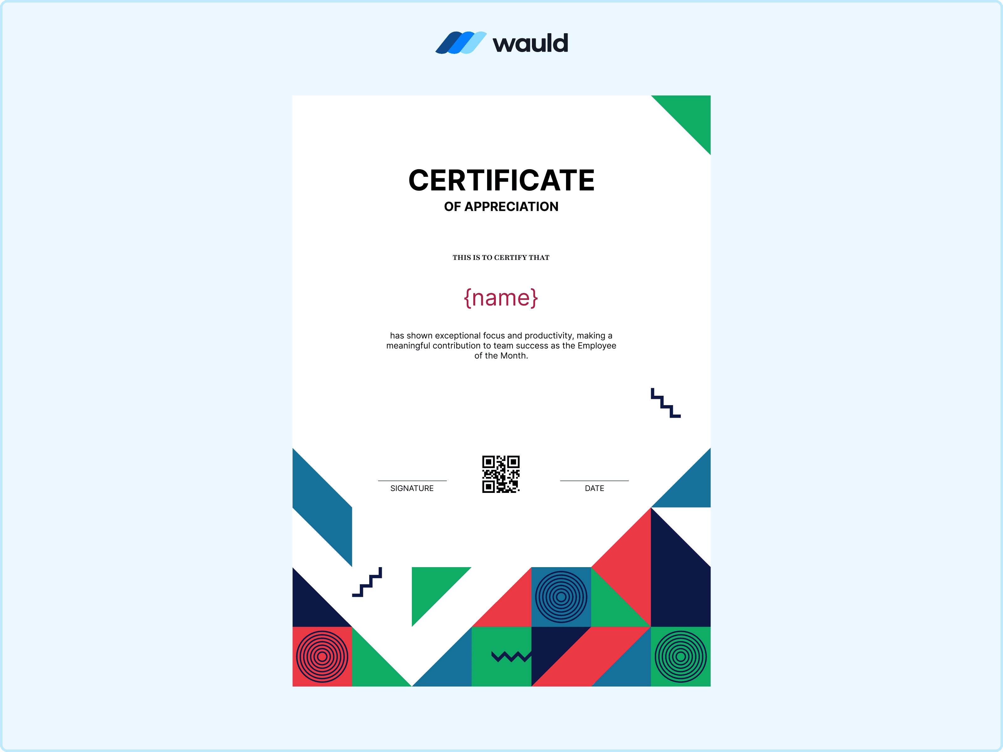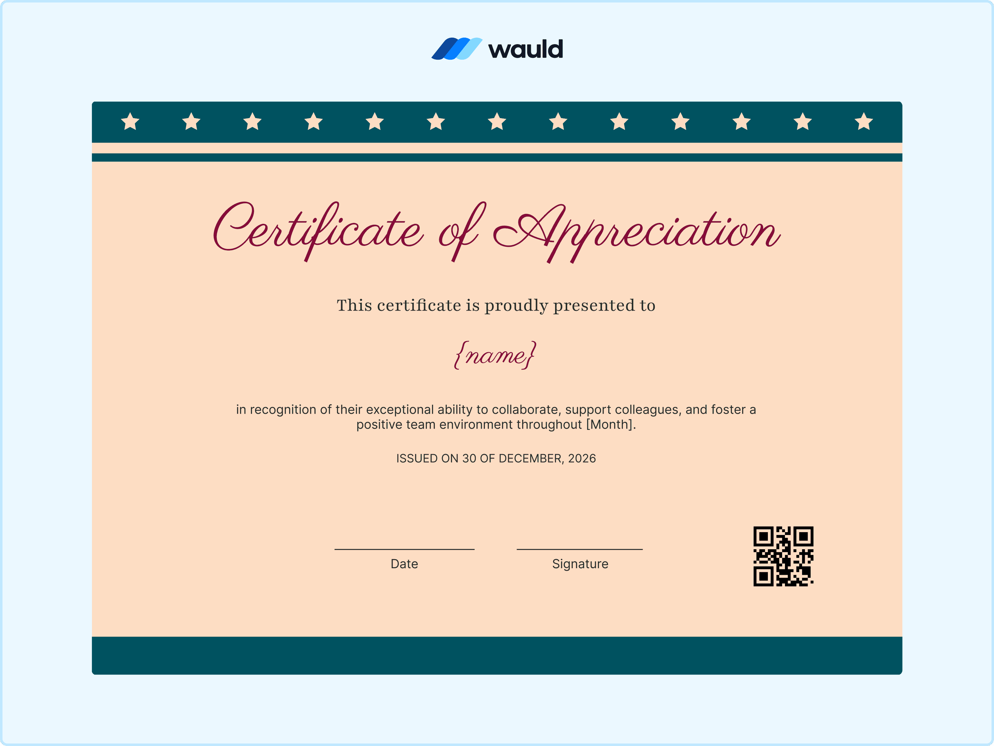 With its detailed patterns and classic styling, this certificate design feels more like a celebration than a routine award. It carries a sense of pride that looks just as good framed as it does shared online. As an Employee of the Month award, adding a QR code through Wauld makes the recognition feel complete and verifiable.