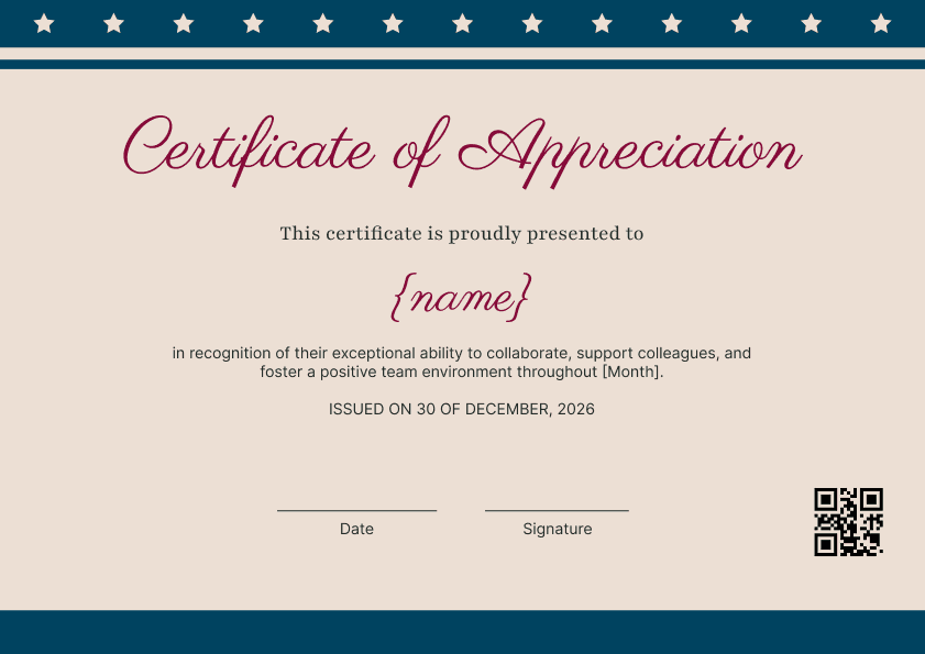 This digital certificate feels gentle and reassuring. The stars, borders, and soft tones give it a timeless quality that doesn’t compete for attention. If you’re recognizing people who quietly keep teams together, this design lets that appreciation feel sincere and unforced.