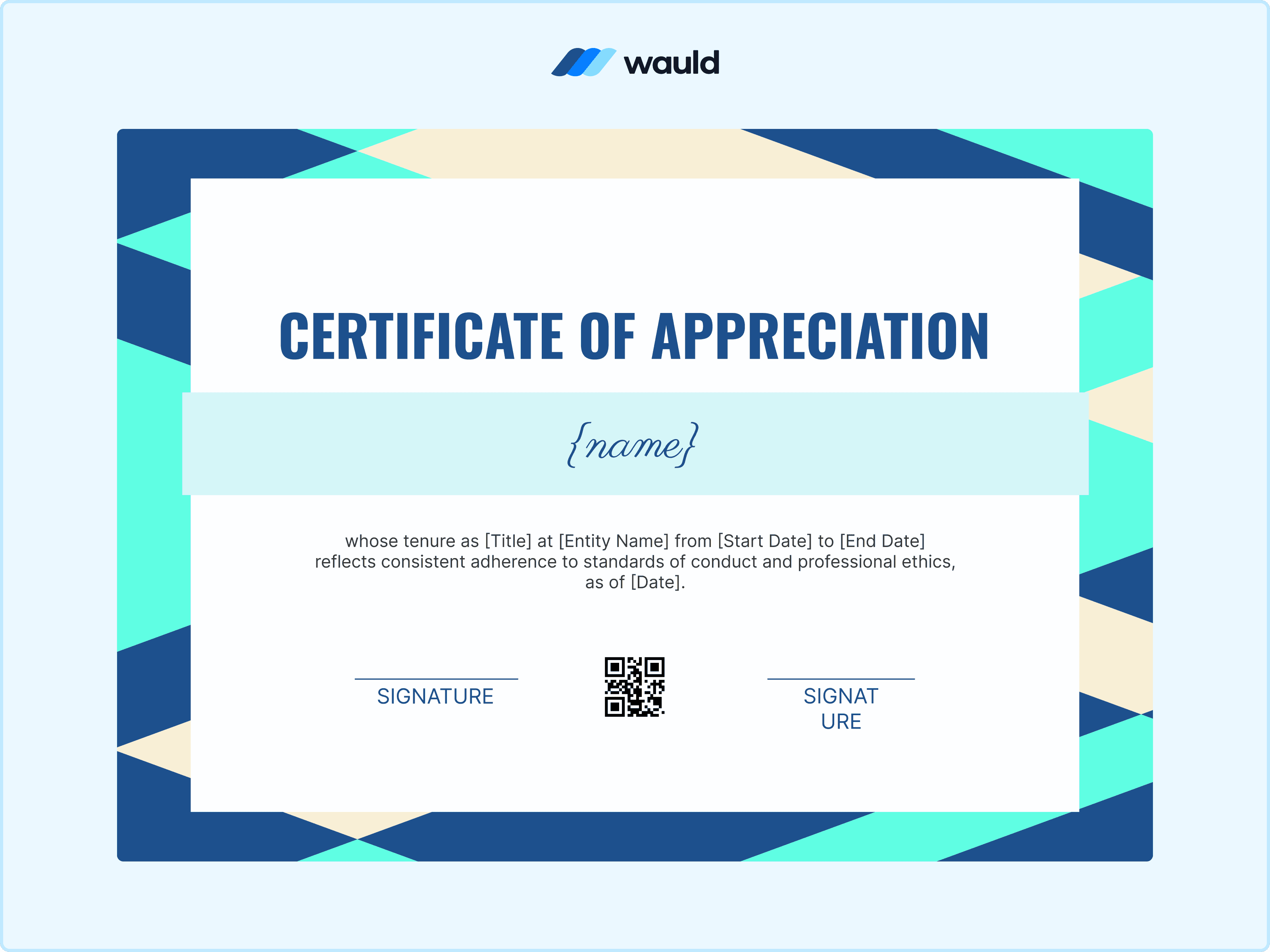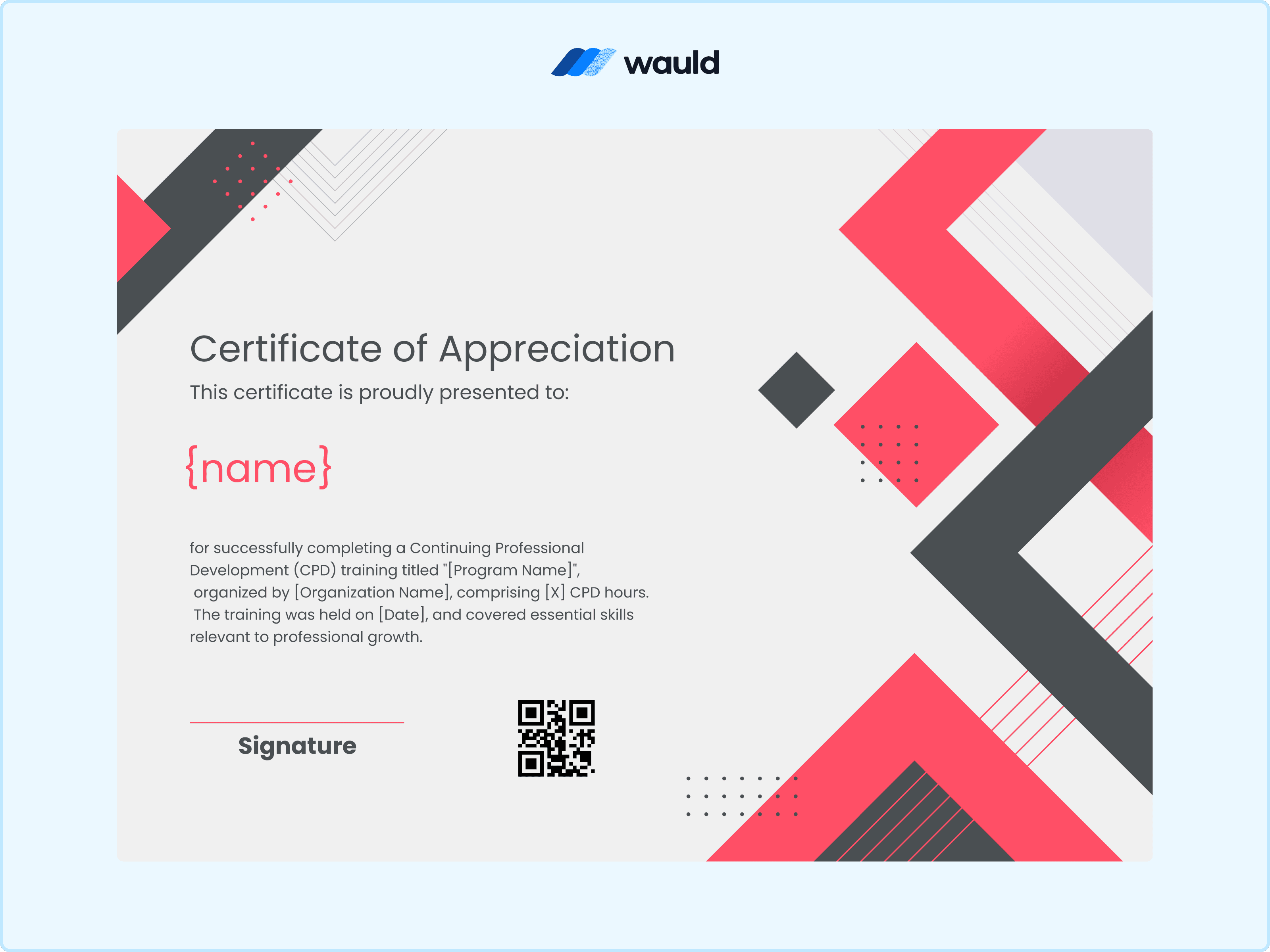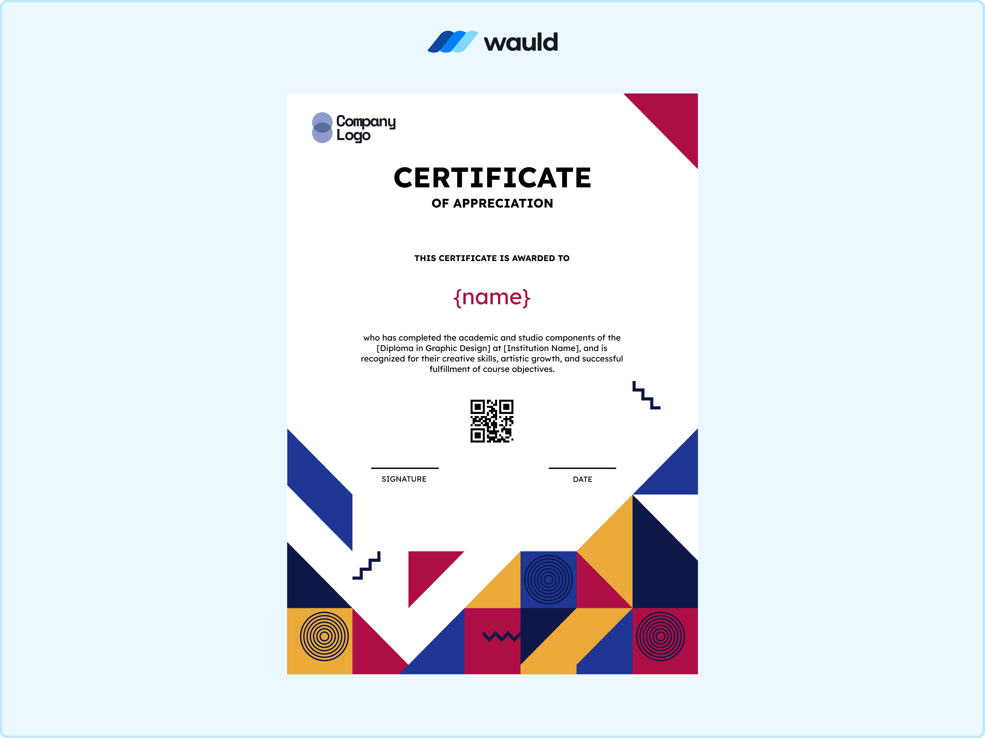 This certificate design includes a strong grid and clear hierarchy, which make achievements feel complete. If you’re marking a milestone or program completion, this design helps that moment feel finished and meaningful. Issuing it through Wauld makes sharing that moment easy.