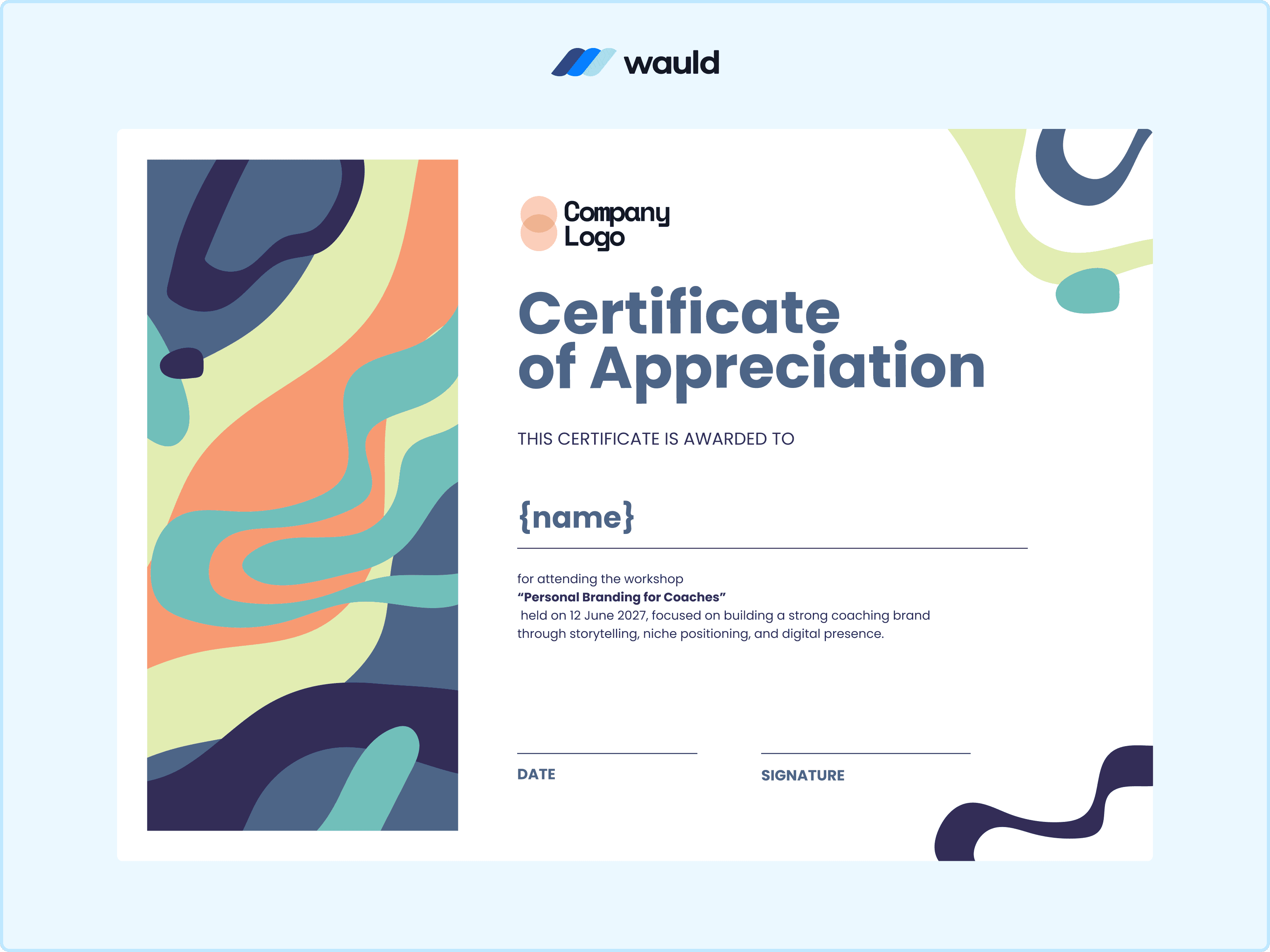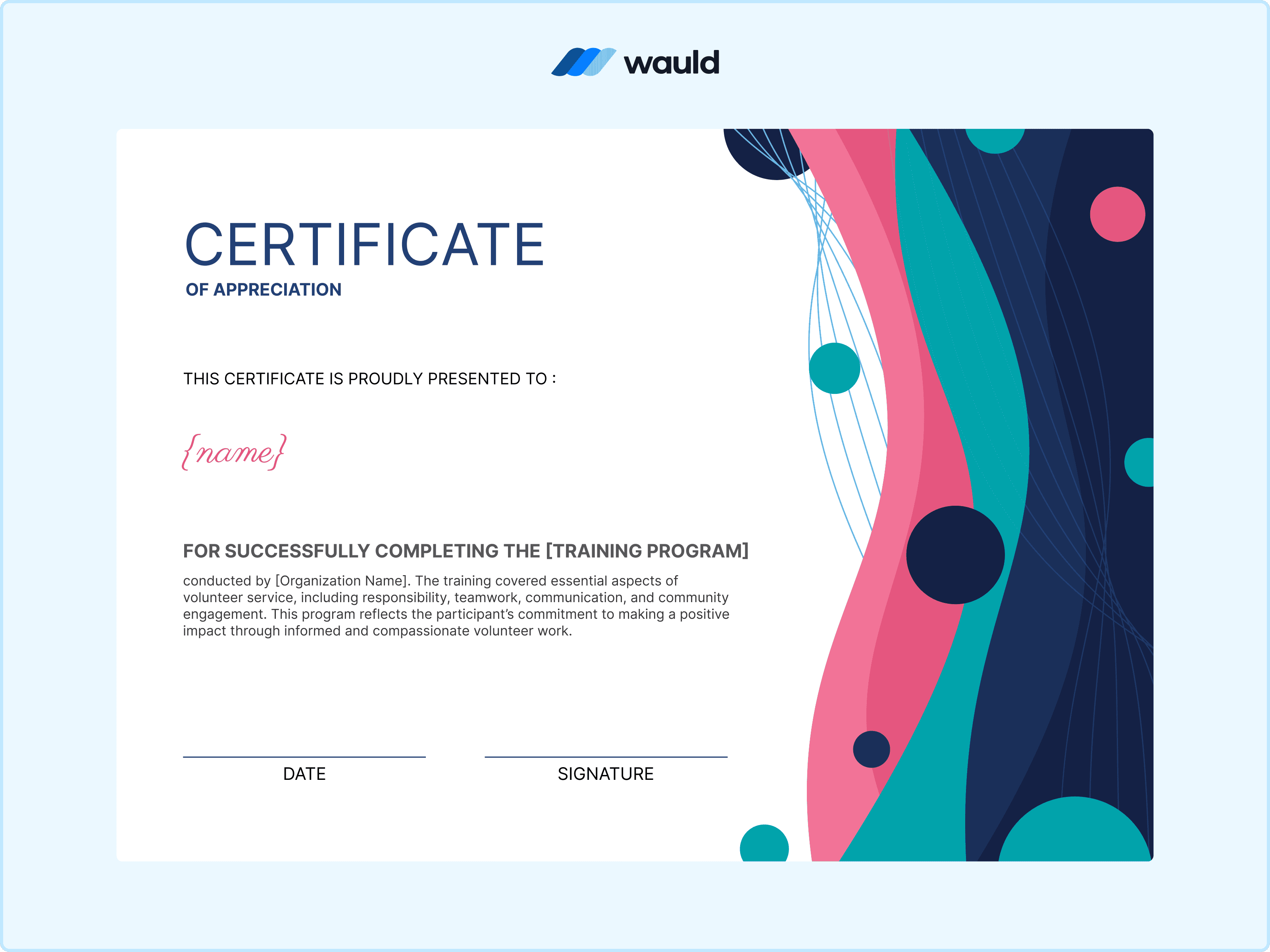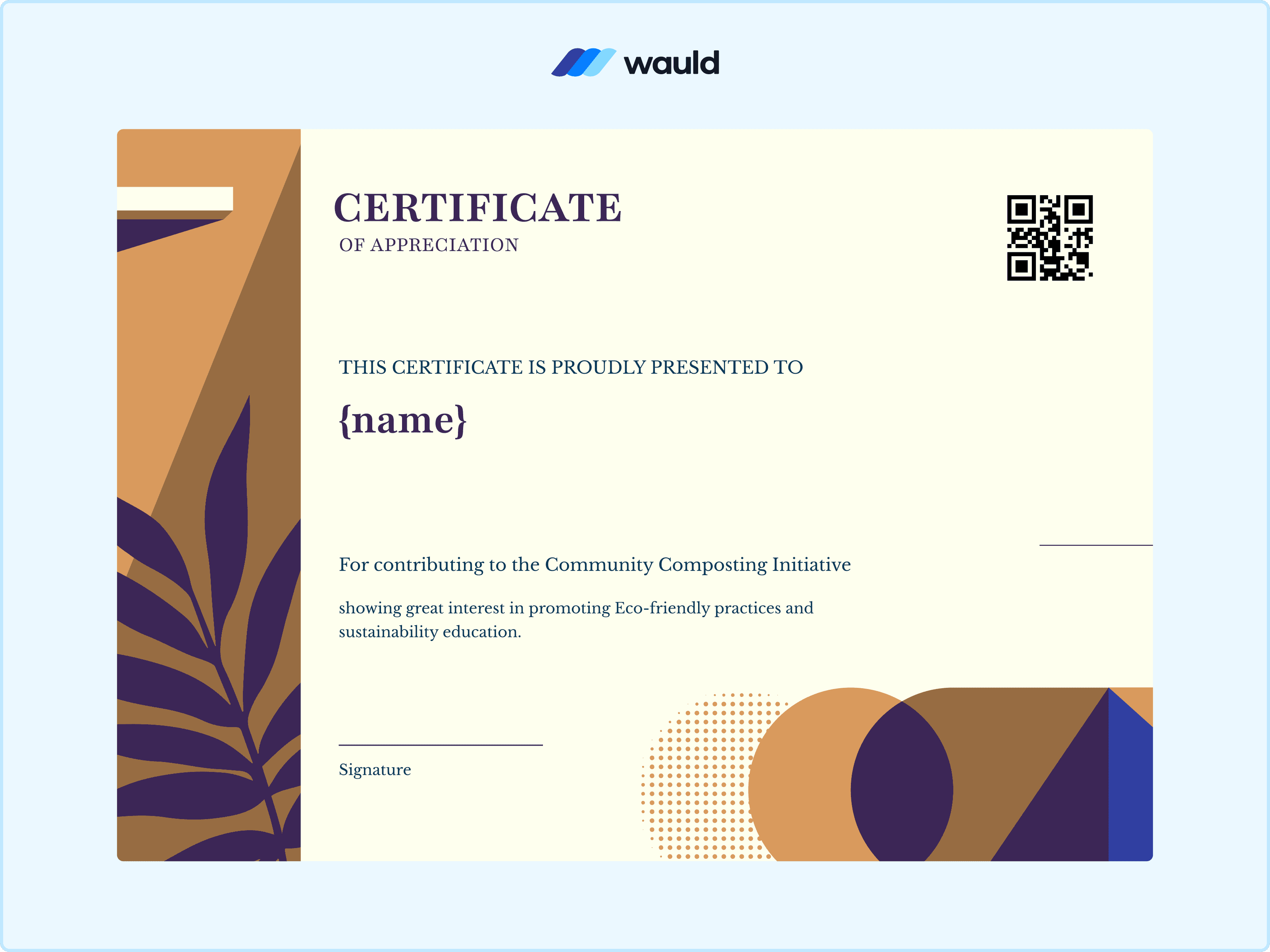 There’s a sense of purpose built into this certificate. The subtle colors and organic shapes give it a thoughtful tone. If you’re acknowledging values-driven or community-focused work, this design supports that intention naturally. Issuing it through Wauld helps keep that meaning consistent.
