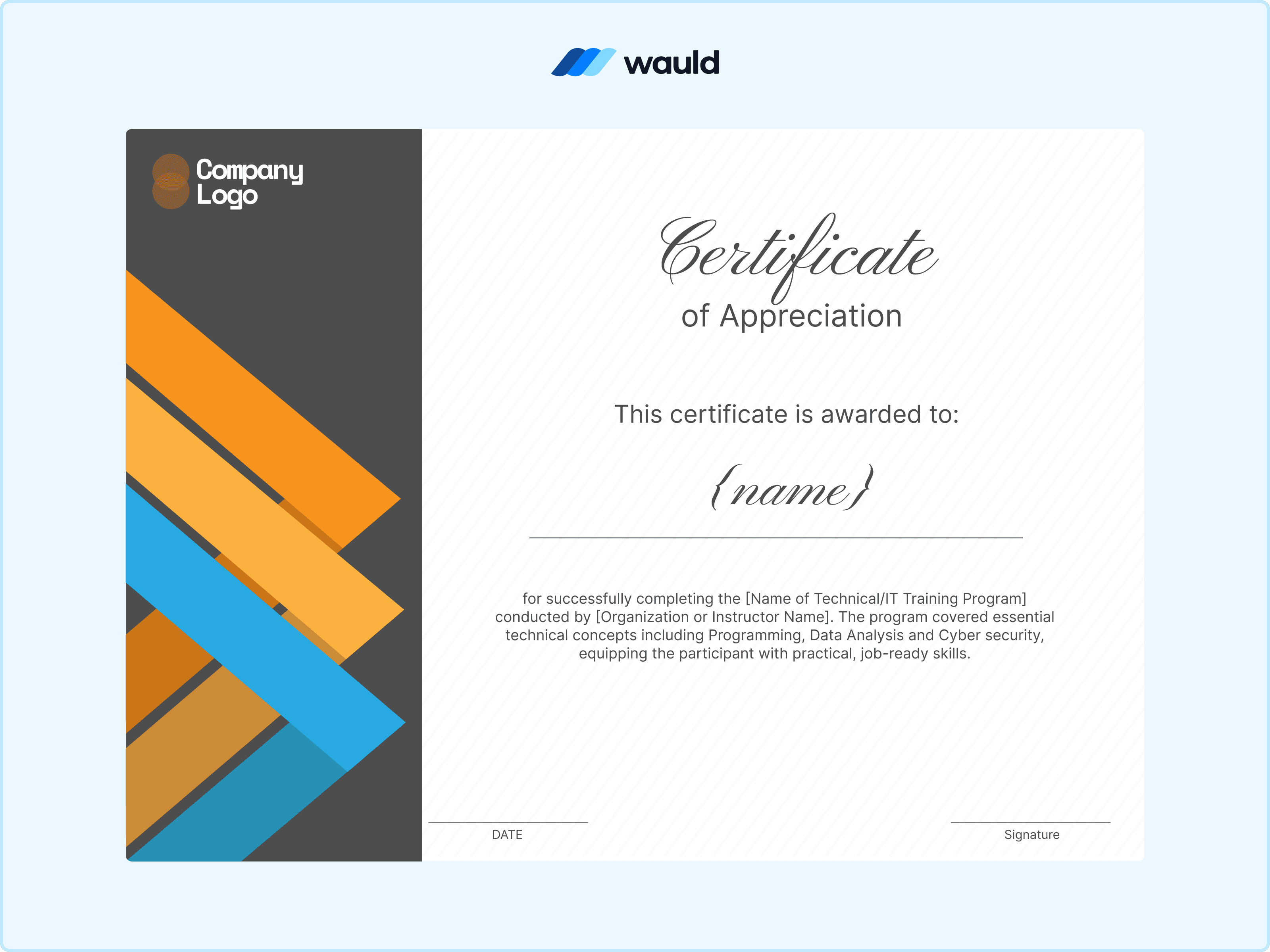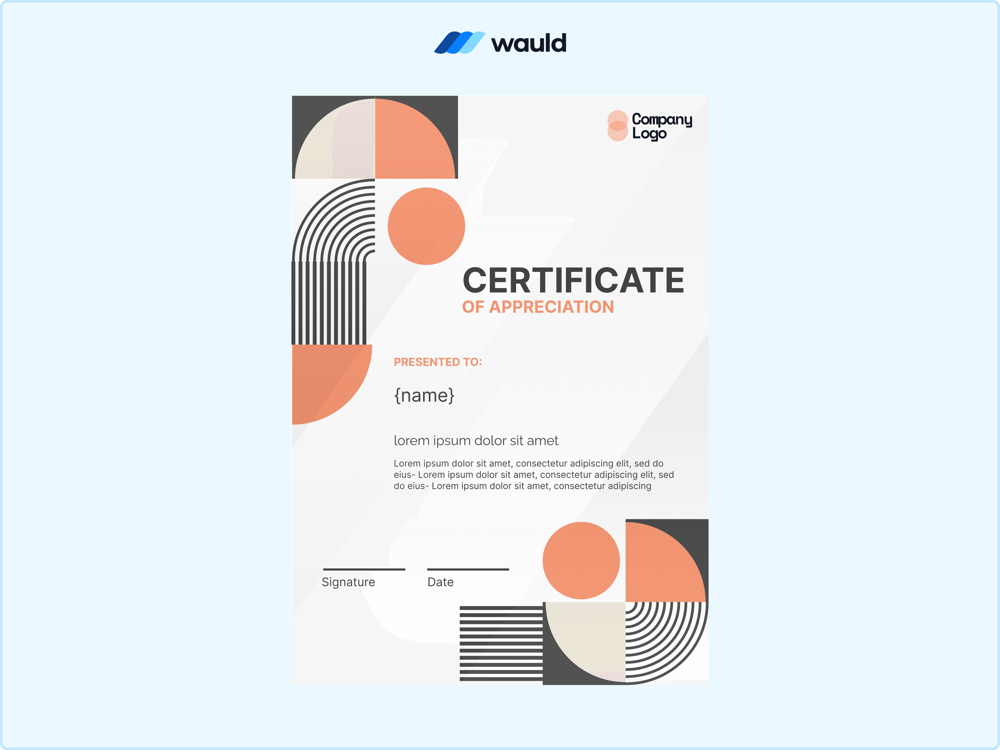 This certificate template has a forward-looking feel. Sharp lines and confident blocks make growth feel visible. If you’re recognizing learning milestones or skill progress, this design helps frame that journey clearly. Managing it through Wauld keeps the process smooth.