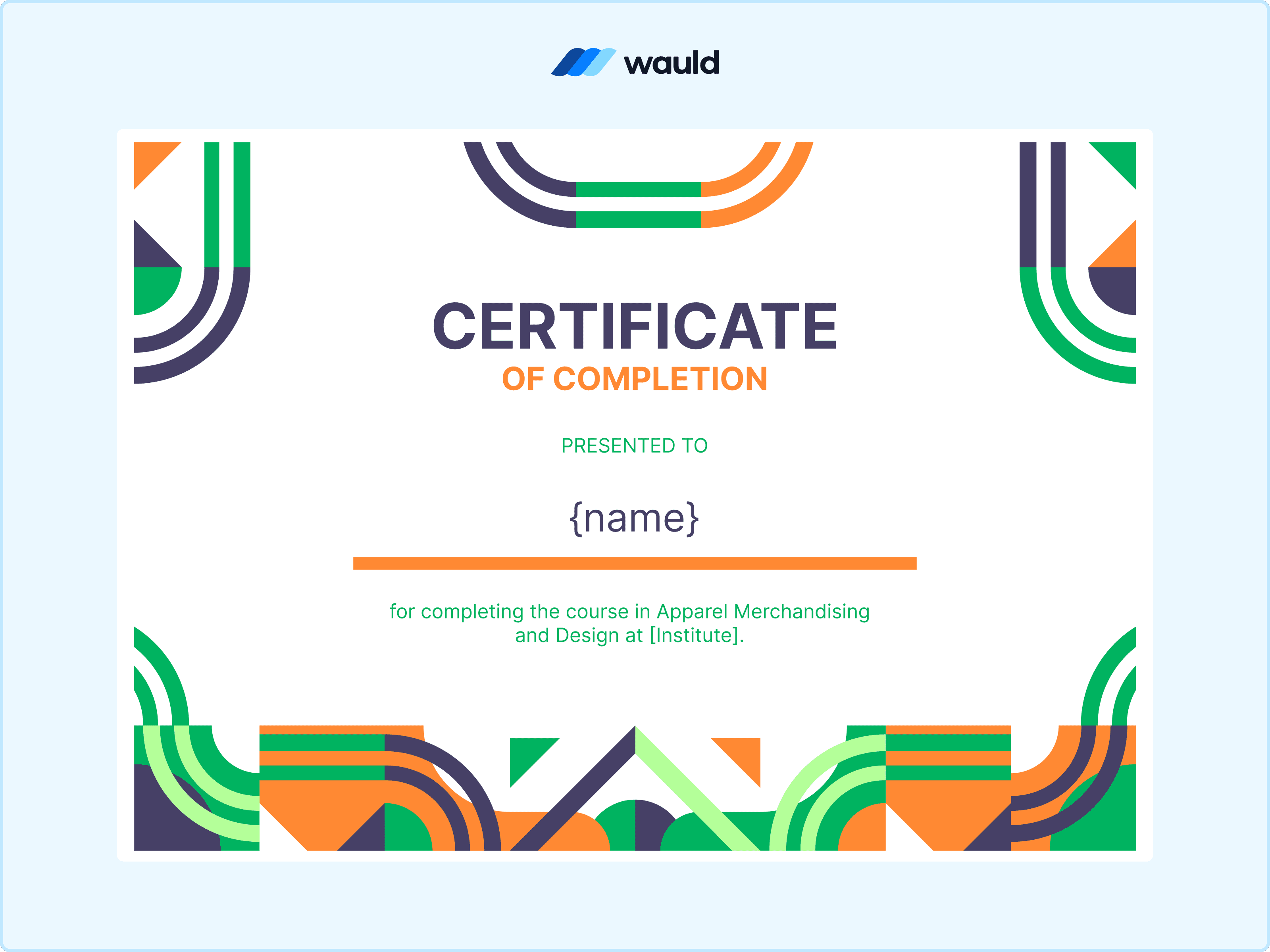 It is built for institutes that want to acknowledge structured learning with visual clarity. The bold geometry and clean typography makes it ideal for fashion, design, or merchandising courses where progress and completion deserve a contemporary, credible presentation.