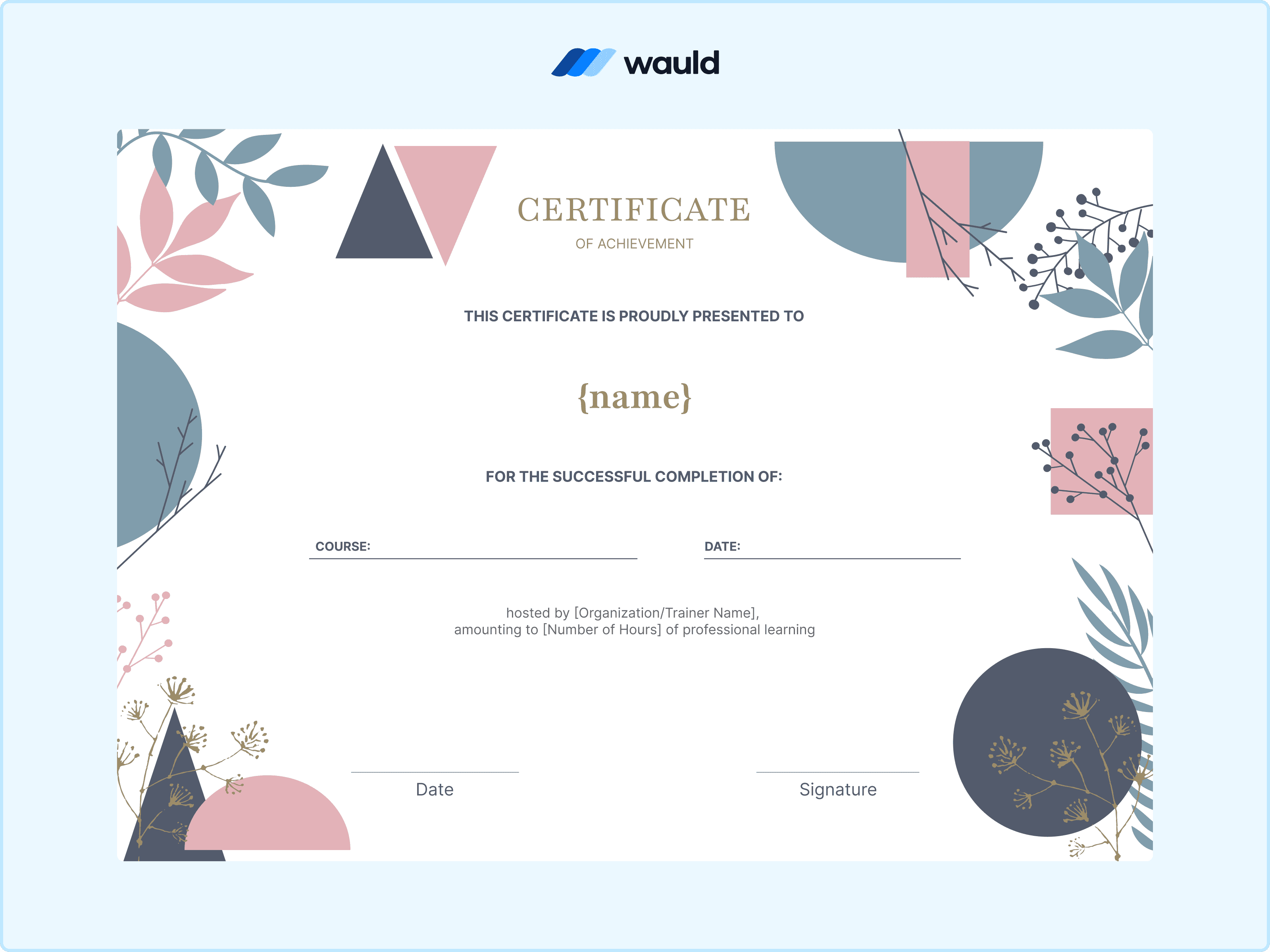 Simply replace the text placeholders with the participant and course details. Add your organization’s logo and use your brand’s fonts and colors. Don’t forget to include the CPD hours, certification body, and a digital signature. Adjust the design and color as needed, and voila!. You have a certificate of your exquisite taste.