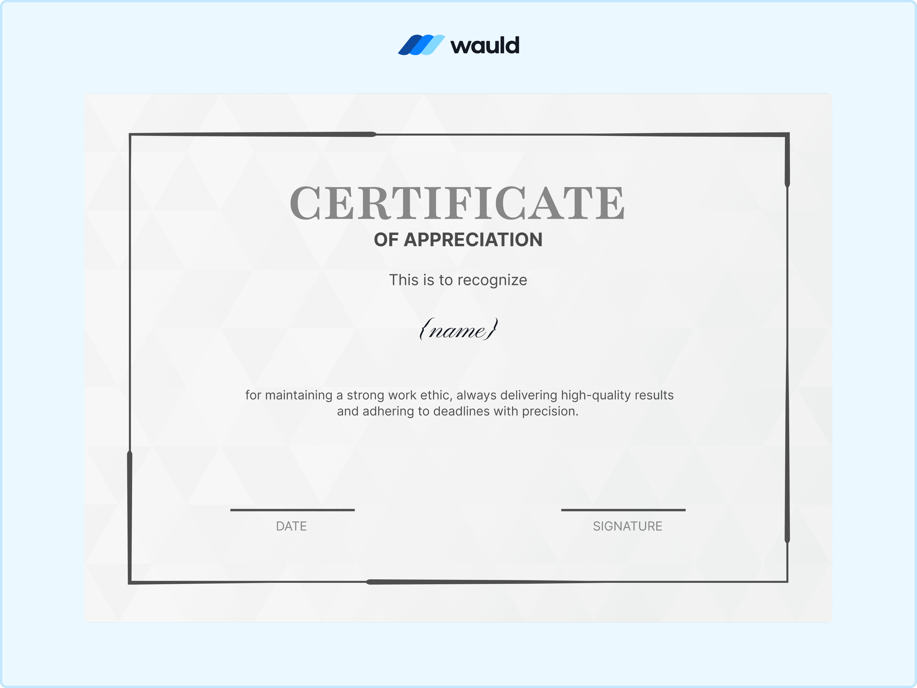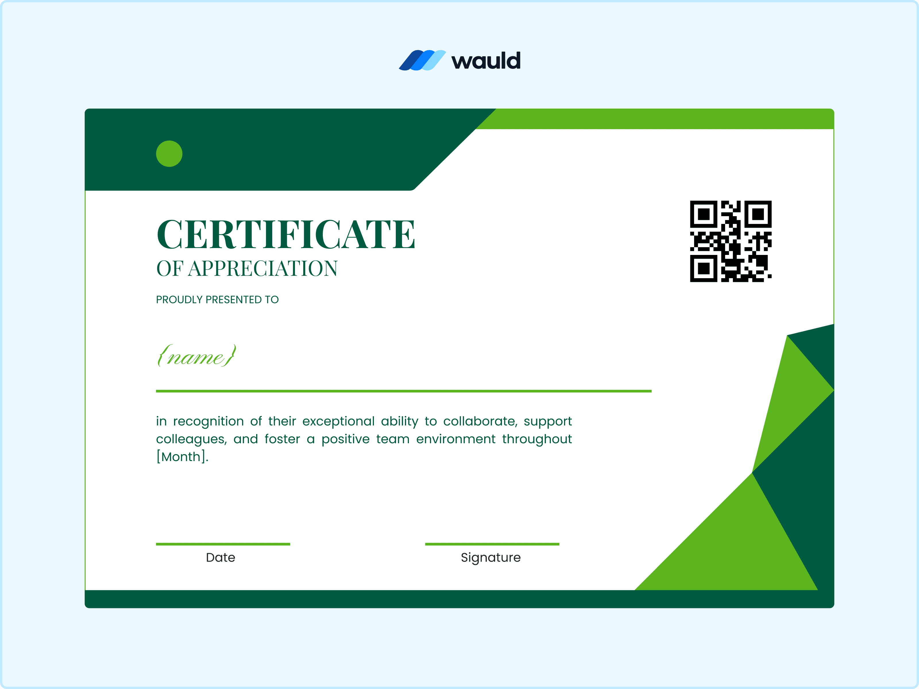 Clean lines and modern shapes keep the focus where it belongs, on the person being recognized. Nothing feels forced here. Issuing this through Wauld works well for acknowledging employees who quietly hold teams together through collaboration and reliability.