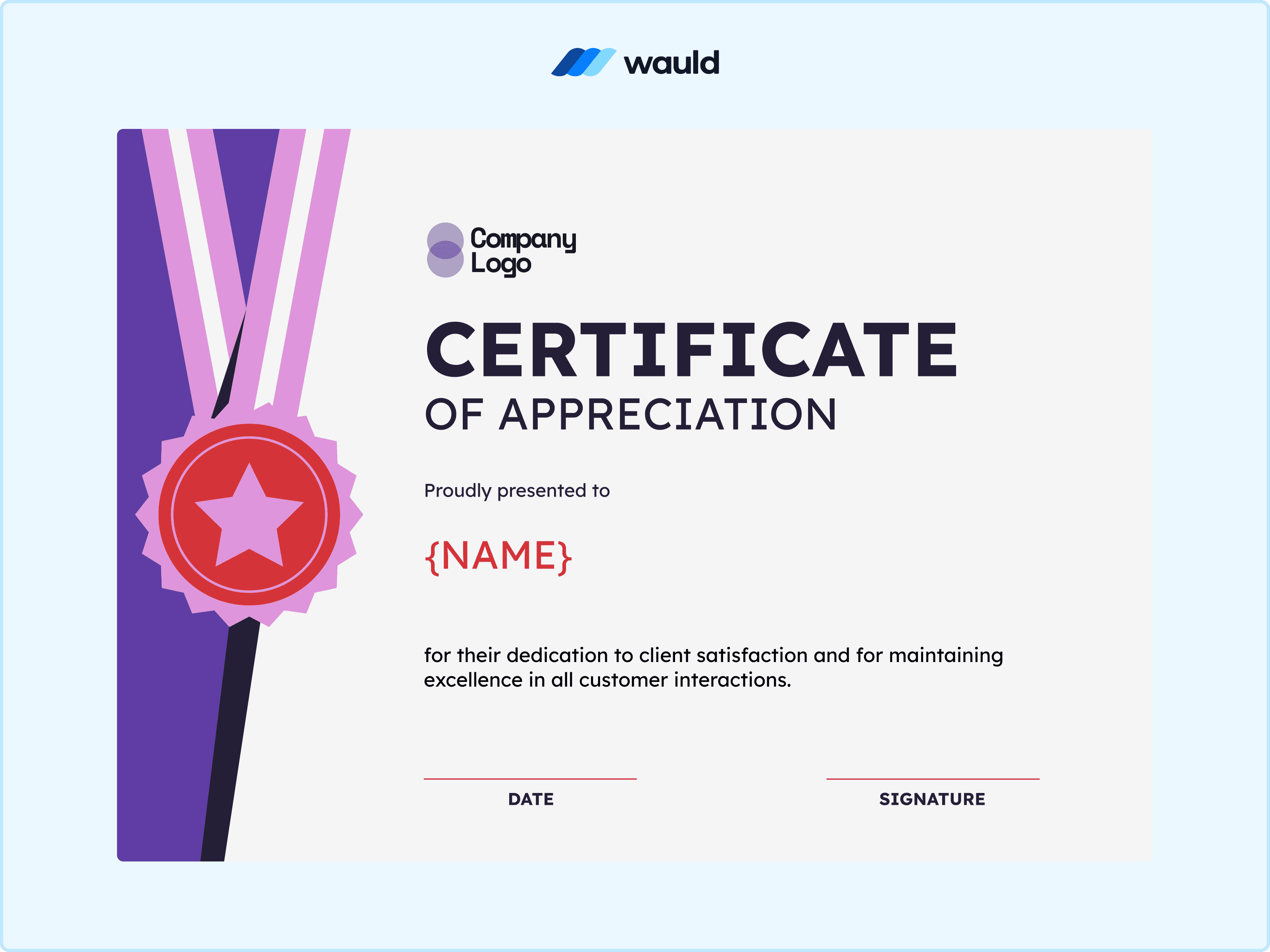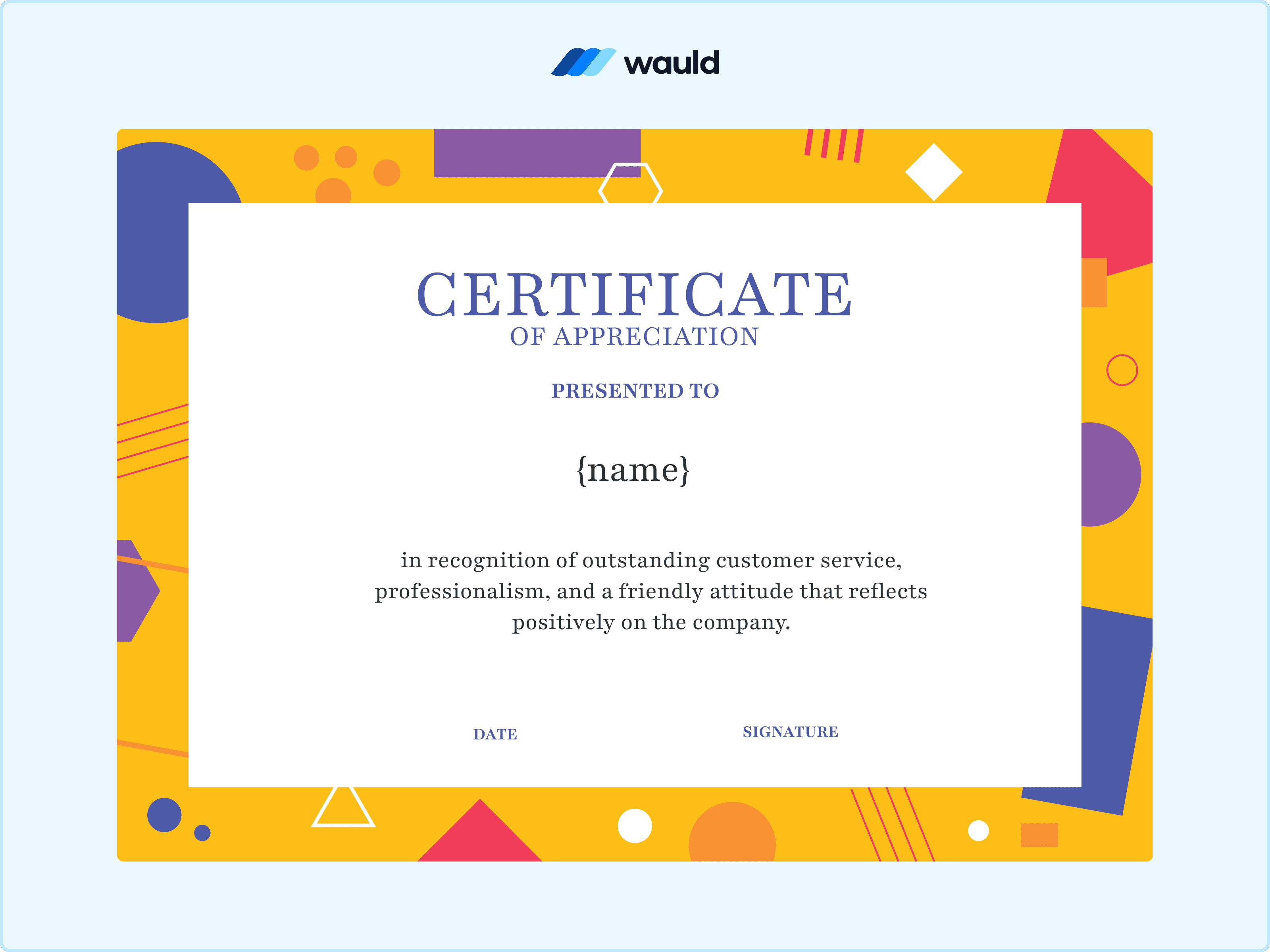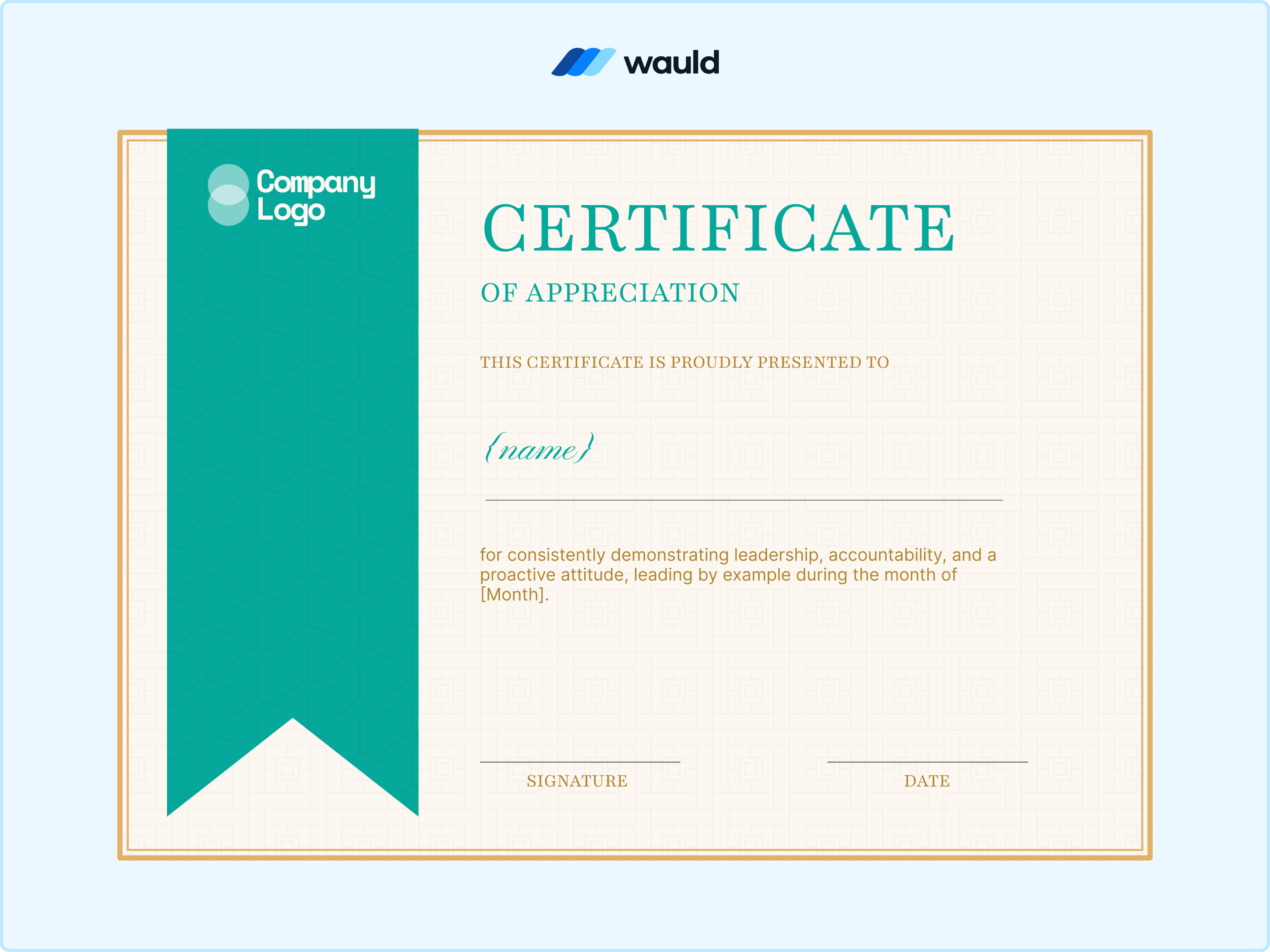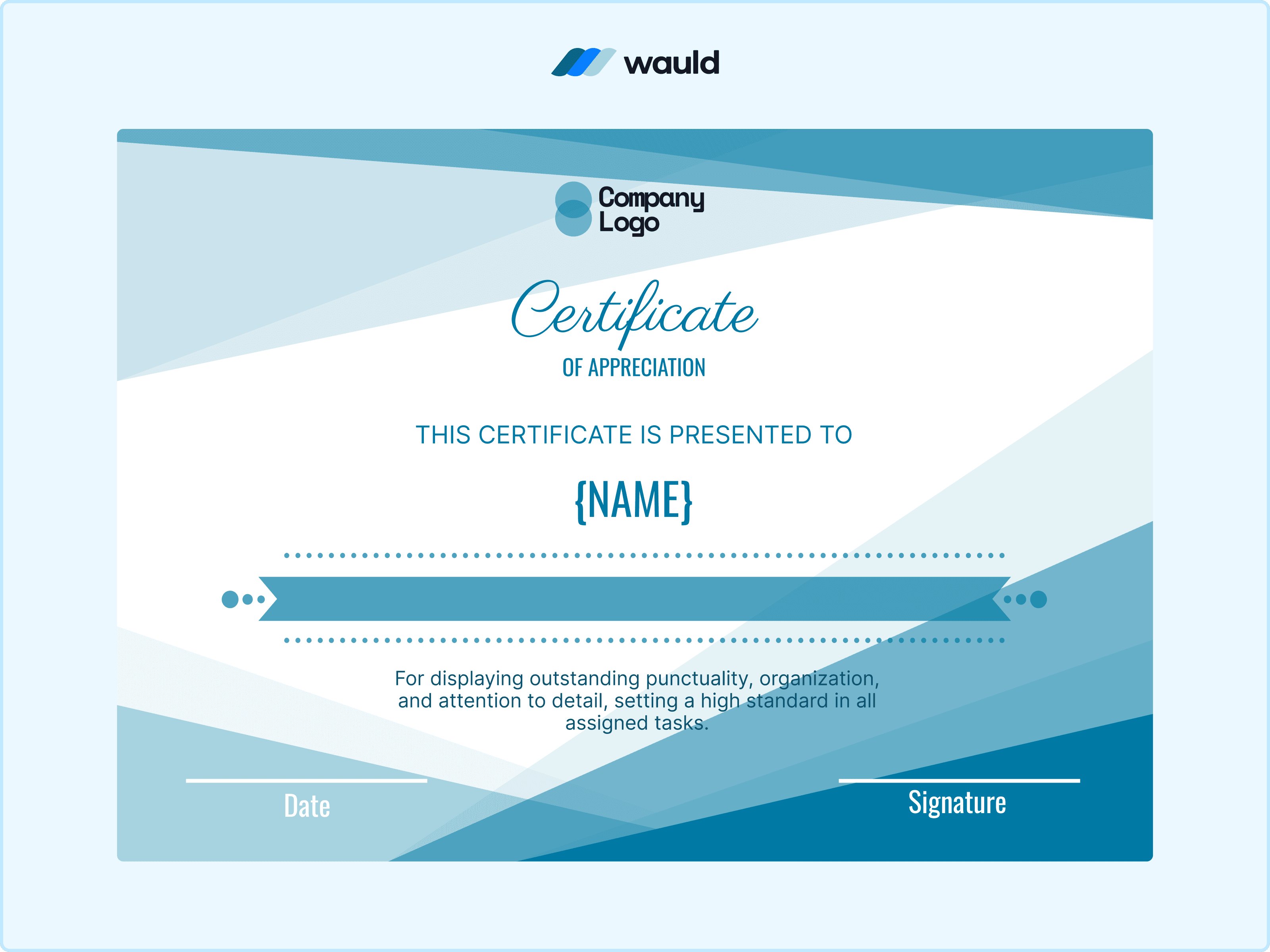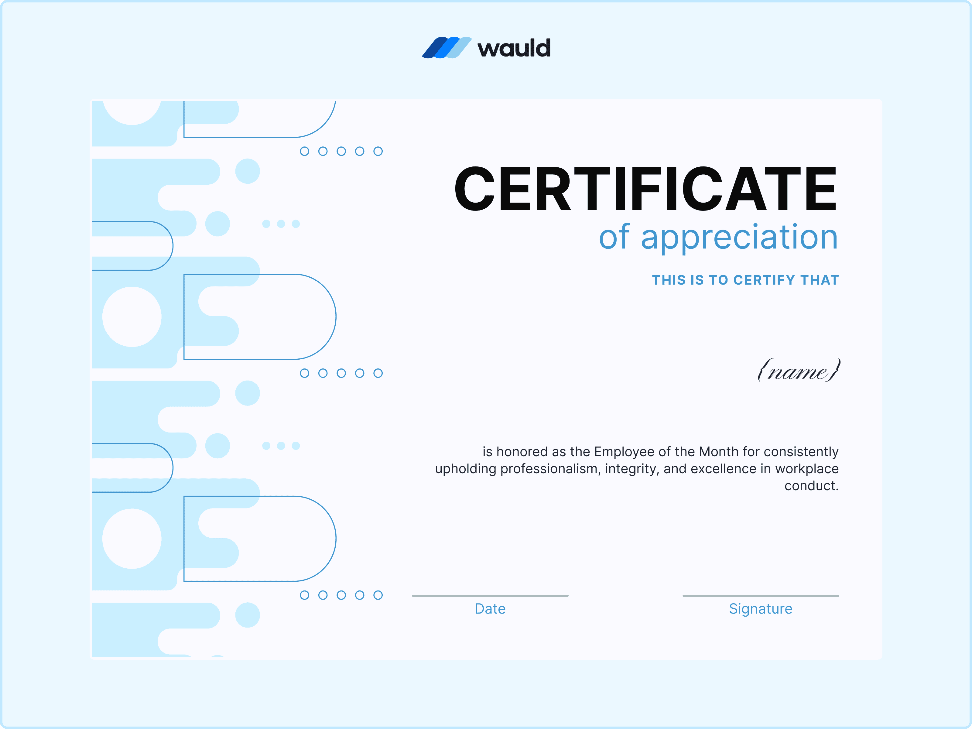 This one feels calm and dependable. The flowing shapes and gentle tones don’t demand attention, but they quietly acknowledge reliability. If you want recognition to feel thoughtful rather than flashy, this certificate template gets that balance right. Issuing this through Wauld makes it easy to recognize steady effort regularly, without the process feeling repetitive.