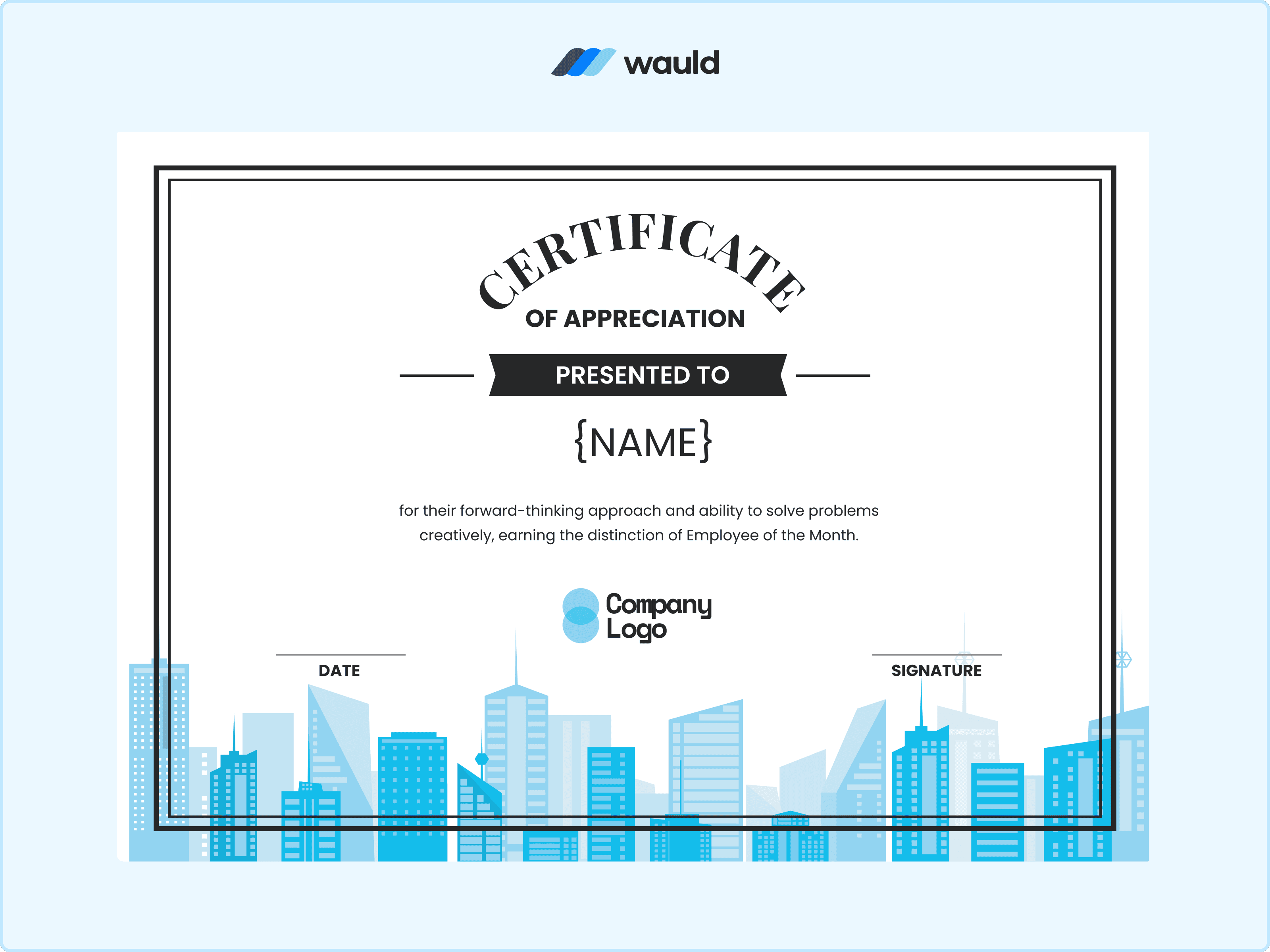 The city-inspired layout gives this digital certificate a sense of ambition. It feels forward-looking, like it belongs to someone who thinks beyond today’s checklist. If you’re recognizing problem-solvers who think big, this design subtly reflects that mindset. Using Wauld here makes it simple to issue and share recognition that celebrates big-picture thinking.