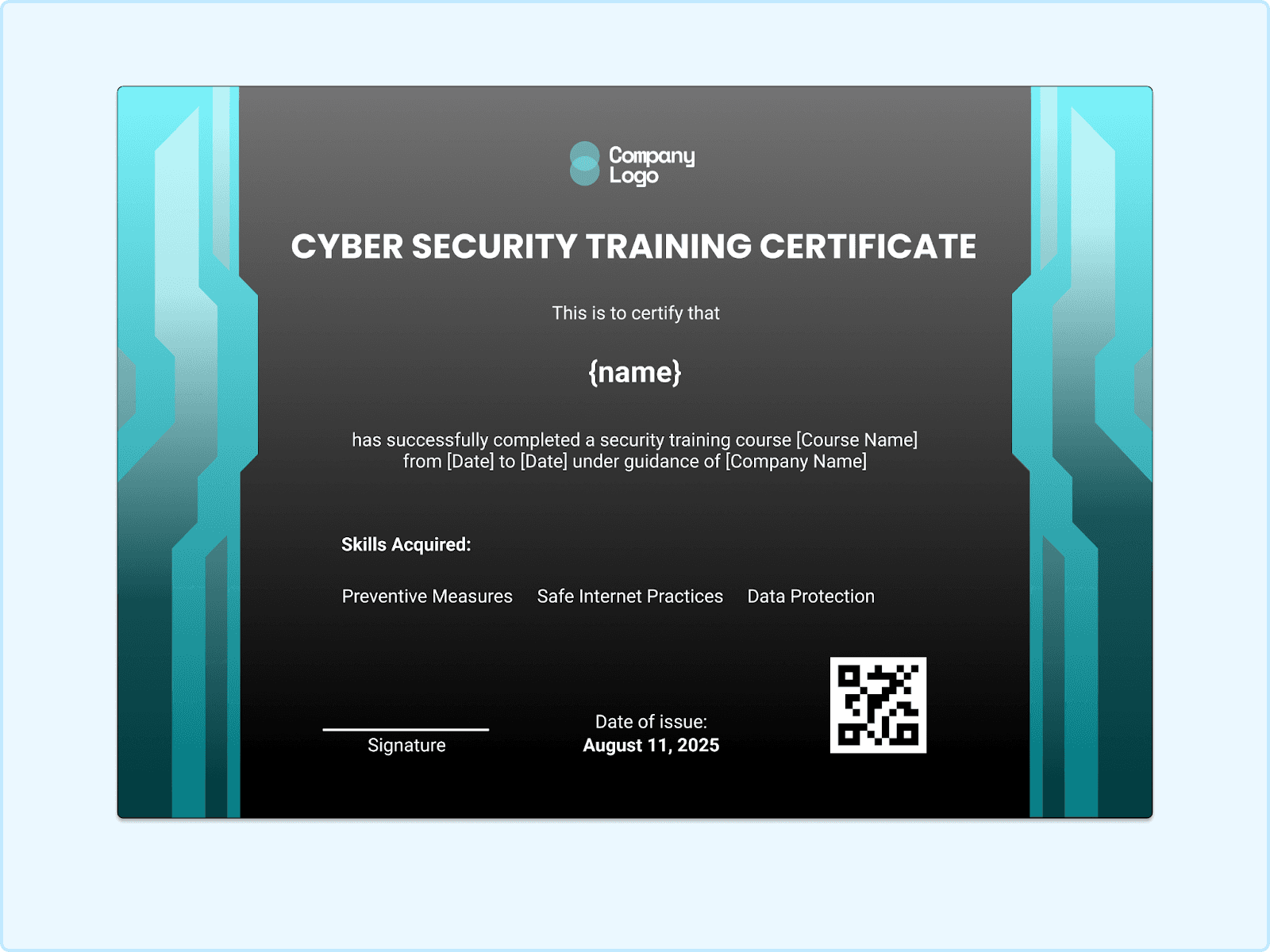 This design feels intense in a good way. The dark background paired with cyan edges creates contrast and focus. It’s ideal for advanced or specialist cybersecurity training where the certificate should feel weighty and important.