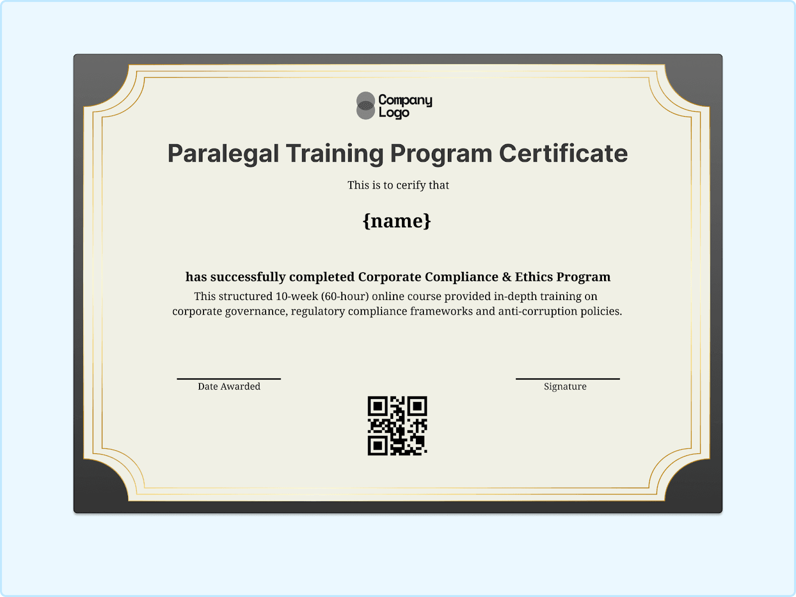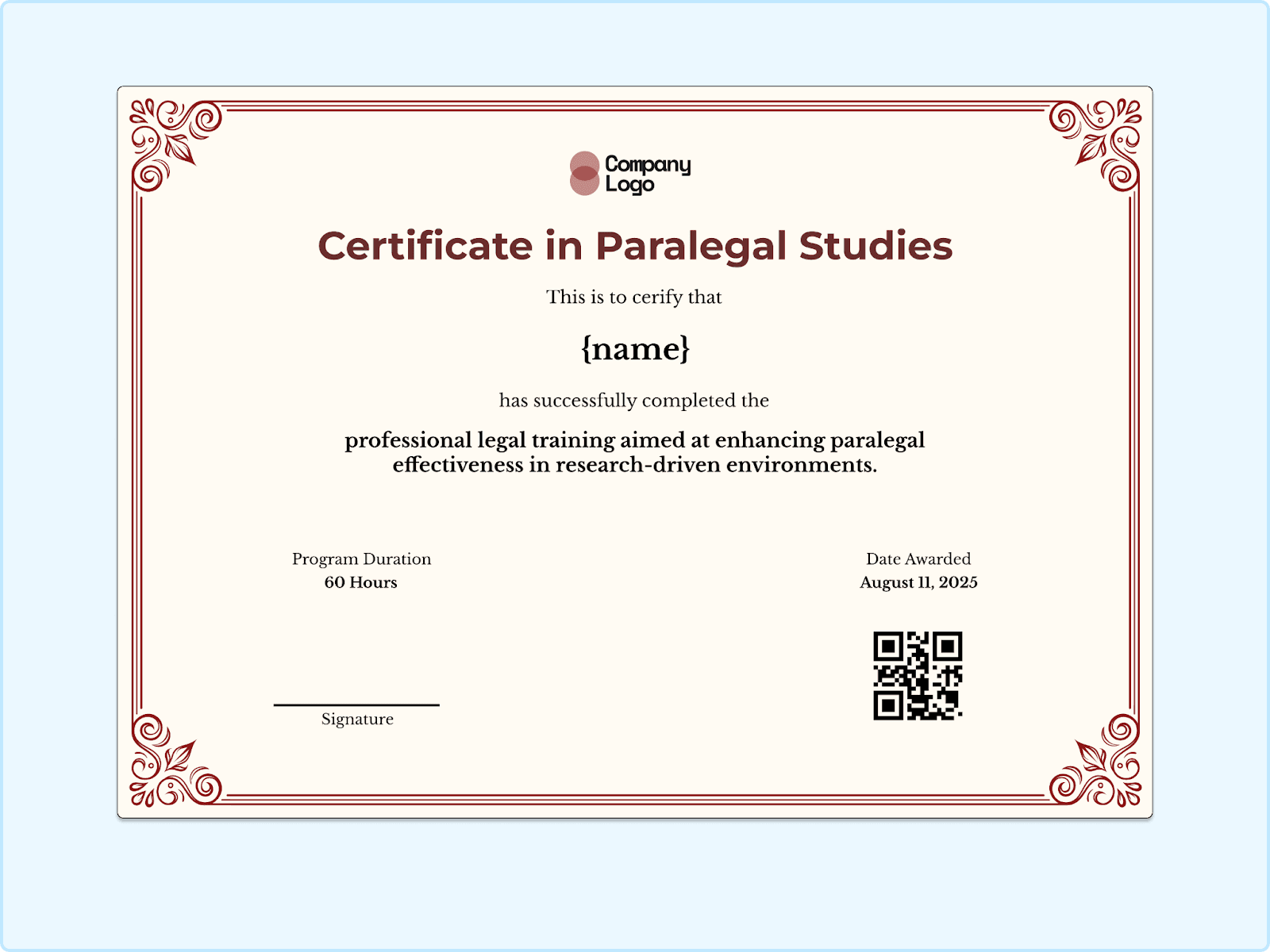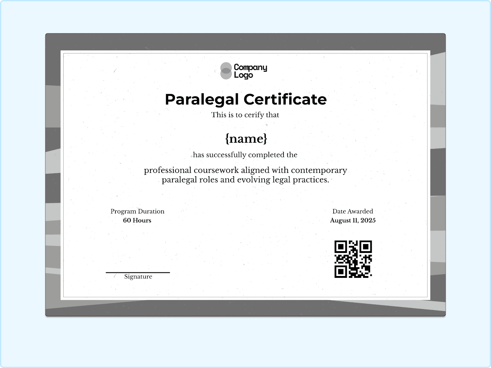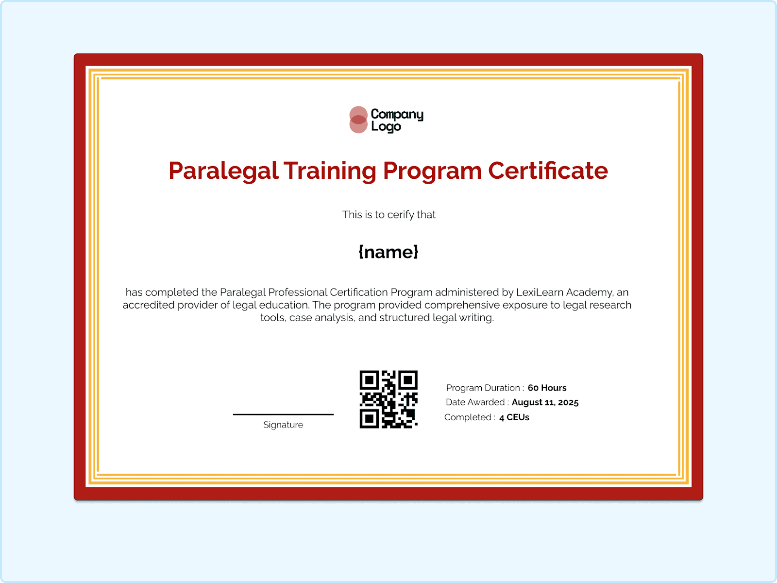 Recognition in the legal field should reflect the values it stands for: integrity, consistency, and trust. A well-crafted paralegal certificate does exactly that. It shows appreciation while maintaining the seriousness and credibility expected in legal environments.