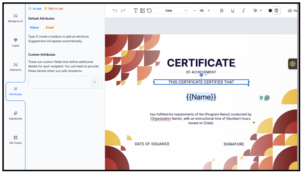 Each recipient’s details automatically populate into the certificate design.