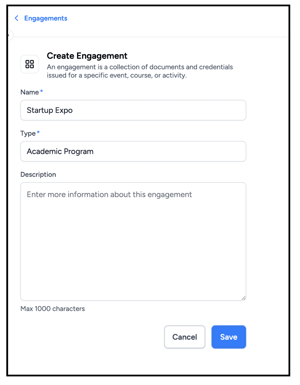 An engagement represents a specific event, course, or program.