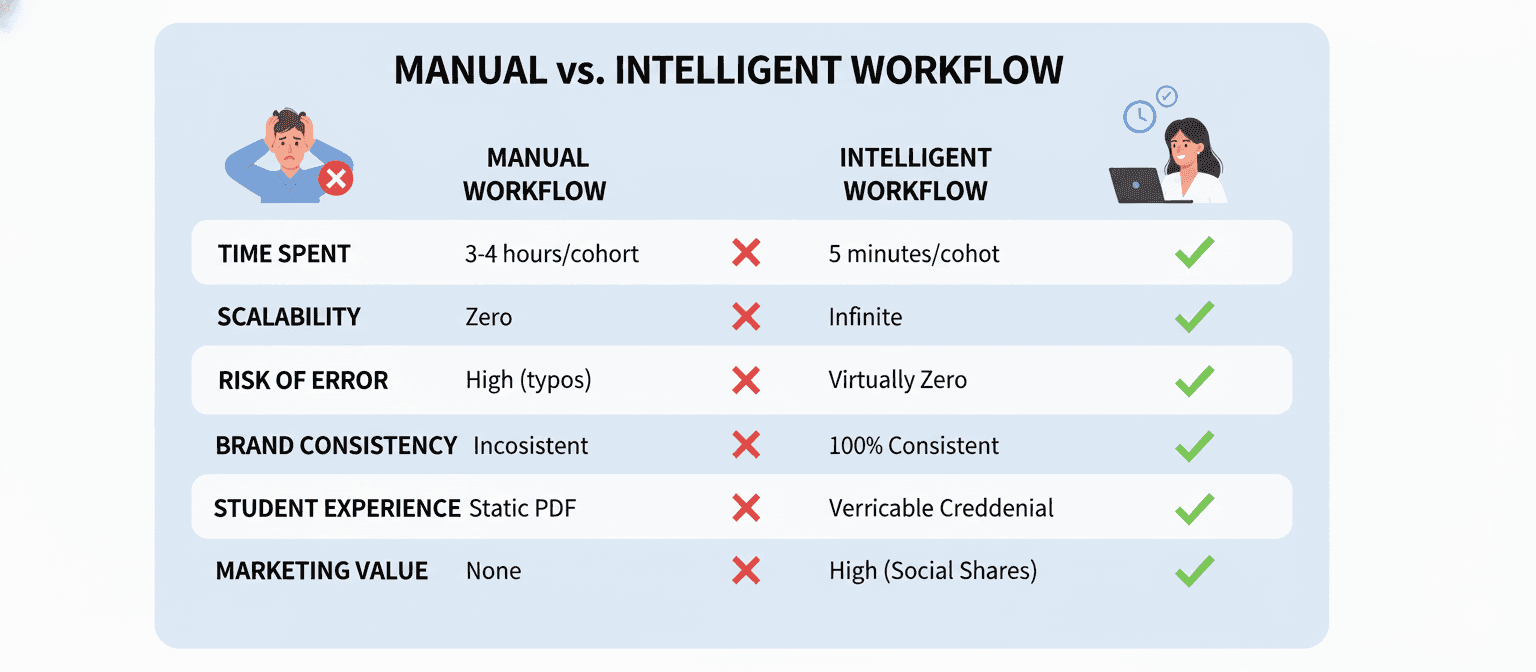 The Process is the Product: A manual, error-prone process results in a simple, unverifiable file. An automated, intelligent process creates a secure, professional, and verifiable credential that reflects the quality of your program.