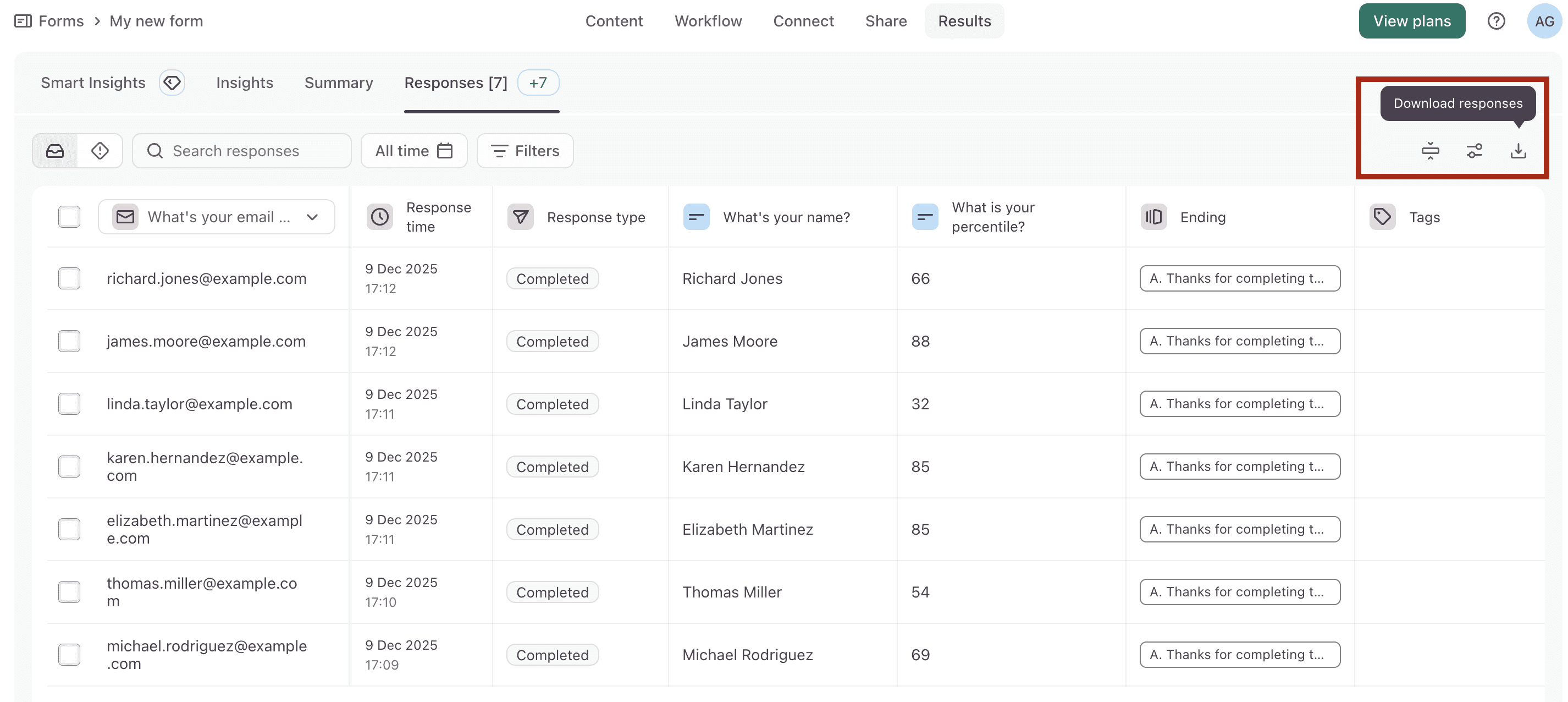 To download responses as a CSV file from Typeform, start by opening your form and going to the 'Results' tab. From there, click on the 'Responses' section to view all the submitted entries. In the top-right corner of the page, click the 'Download' responses icon to open the download options.
