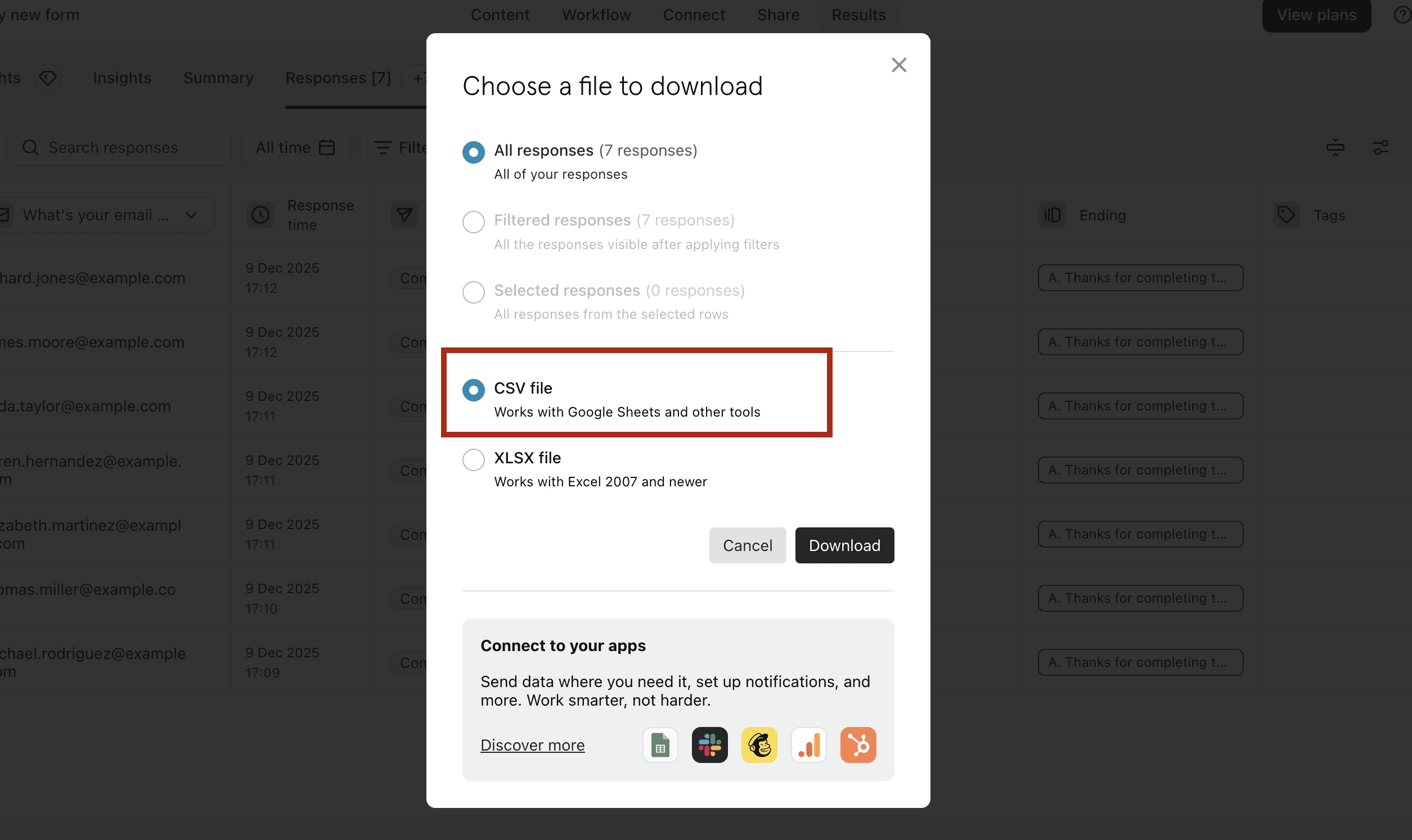 In the pop-up window that appears, choose whether you want to download all responses, filtered responses, or only selected ones. Select the CSV file option, which works well with Google Sheets and other tools. Finally, click Download to save the CSV file containing your form responses to your computer.