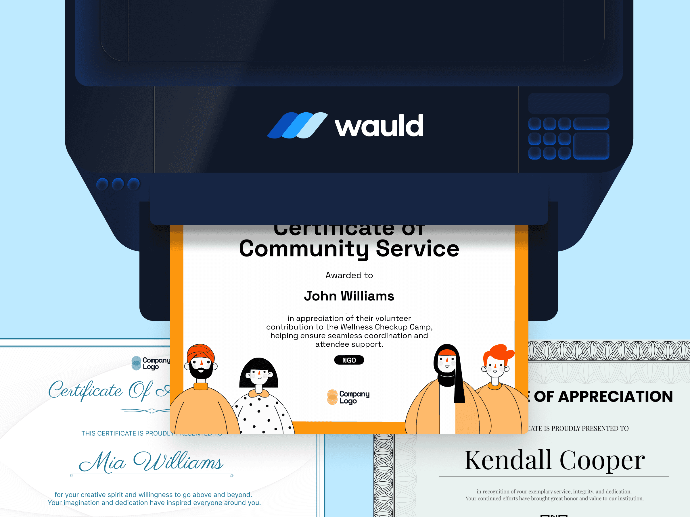 Wauld Tip: Don’t stress over choosing between portrait or landscape. With Wauld’s 600+ certificate templates, you get both styles ready to go. And if your event calls for something unique, Wauld also lets you design in custom sizes