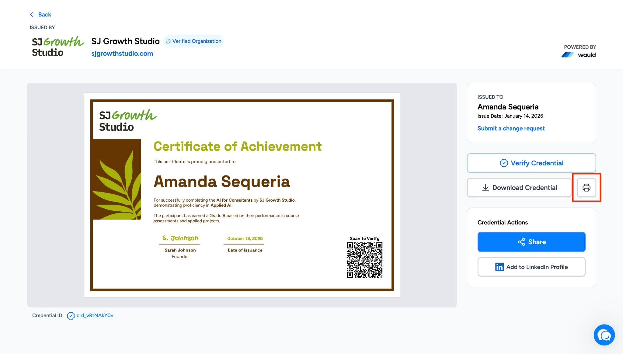 Finally, consider adopting digital credentials through Wauld. They combine the visual appeal of a certificate with automated issuance, built‑in verification and one‑click sharing. This modern format not only saves time but also protects the integrity of your credentials and enhances your learners’ achievements. Moreover, certificates can be easily printed by both the issuer and the recipient whenever needed, ensuring flexibility for physical copies alongside digital access.