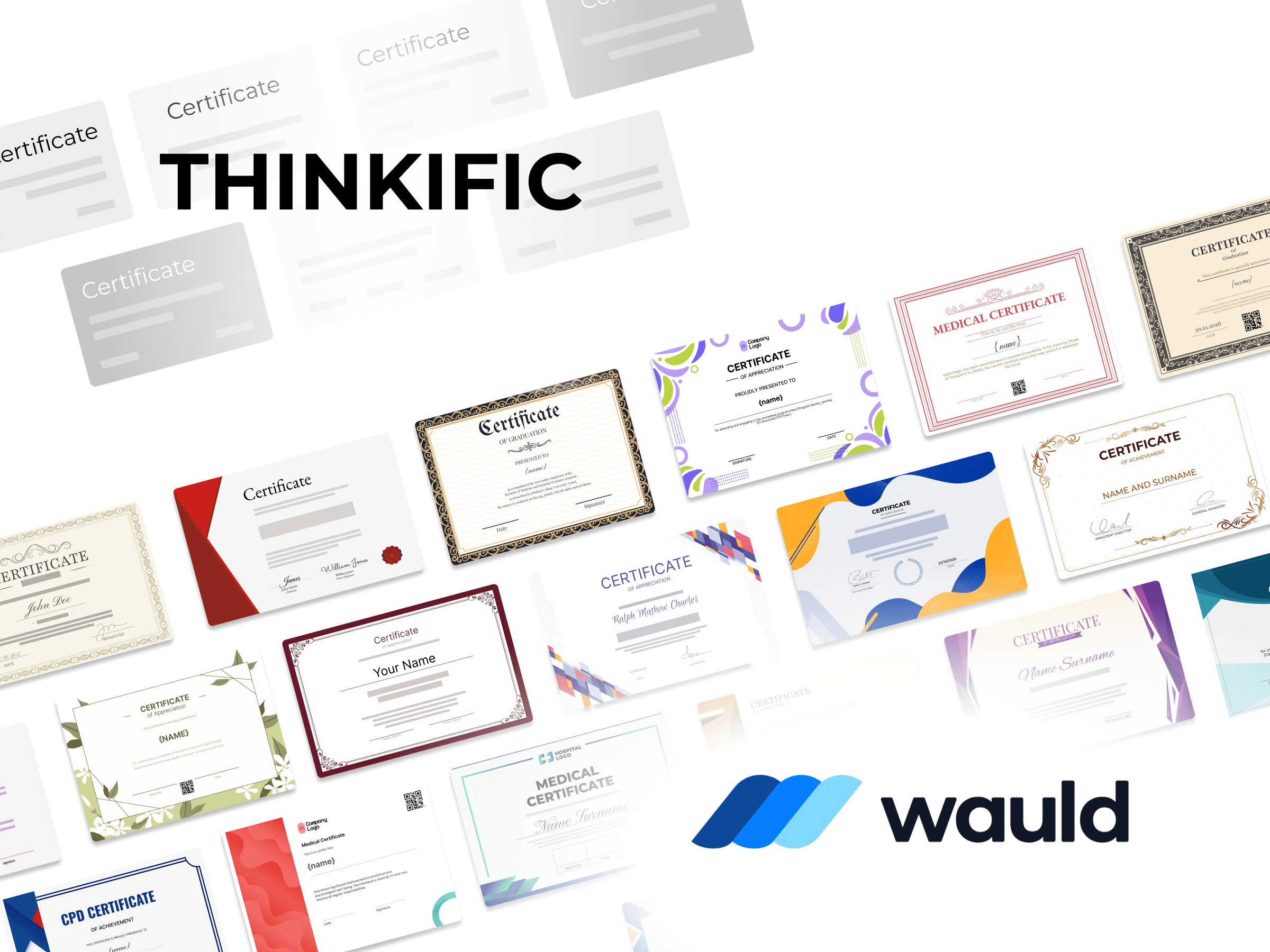 Thinkific offers 7 preset certificate templates, whereas Wauld includes more than 600 – each fully customizable for layout, colors, and custom fields, along with the option for users to design a certificate from scratch, allowing them to also customize the size of their certificates!