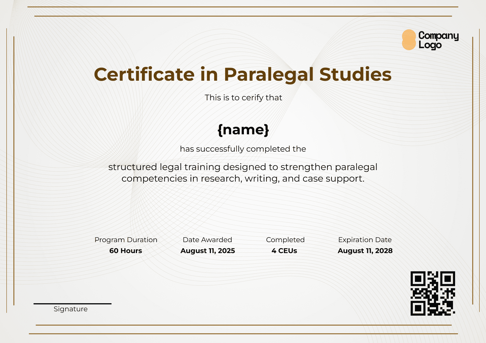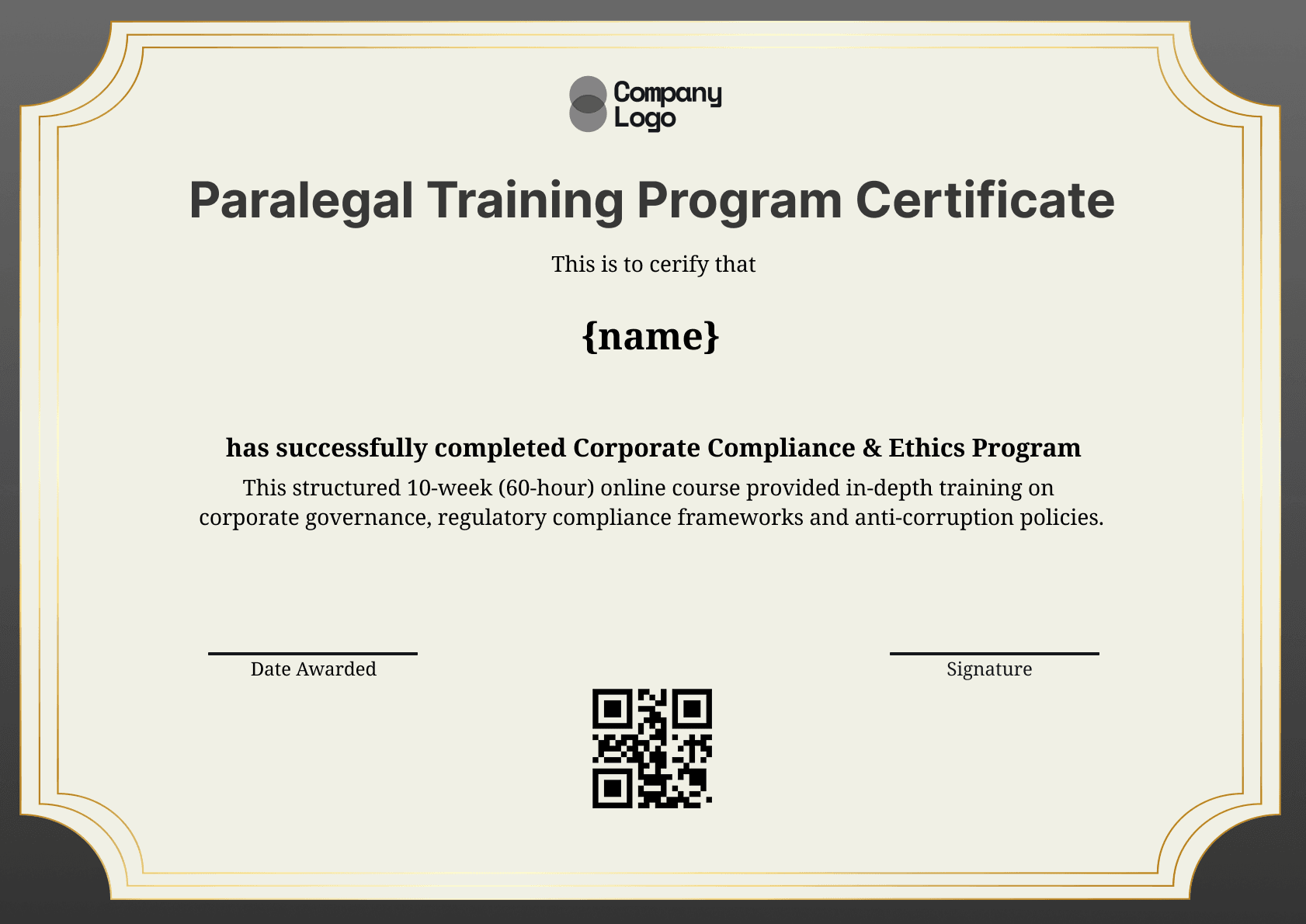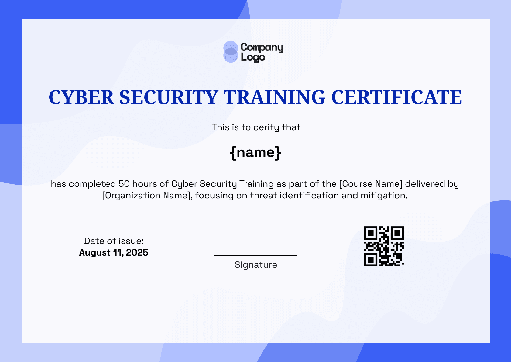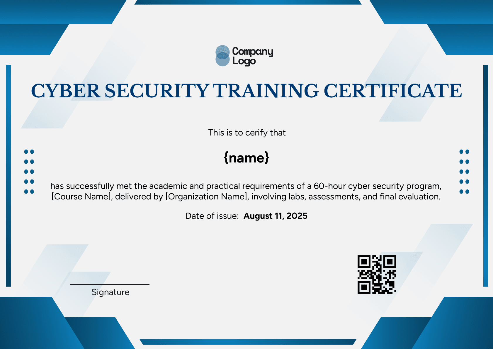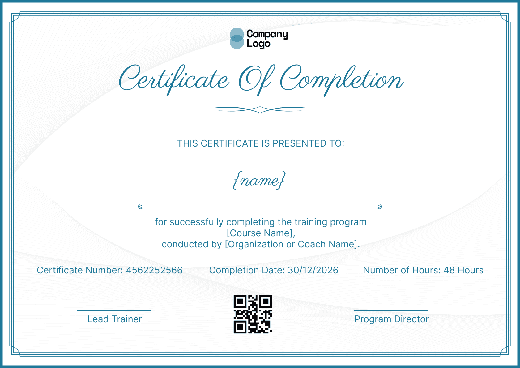 Designed for universities, academies, and certification bodies, this layout provides clean space for the recipient’s name, course title, institution name, and other relevant credentials. A QR code is included for digital verification, making it adaptable for both printed and online certification systems.
