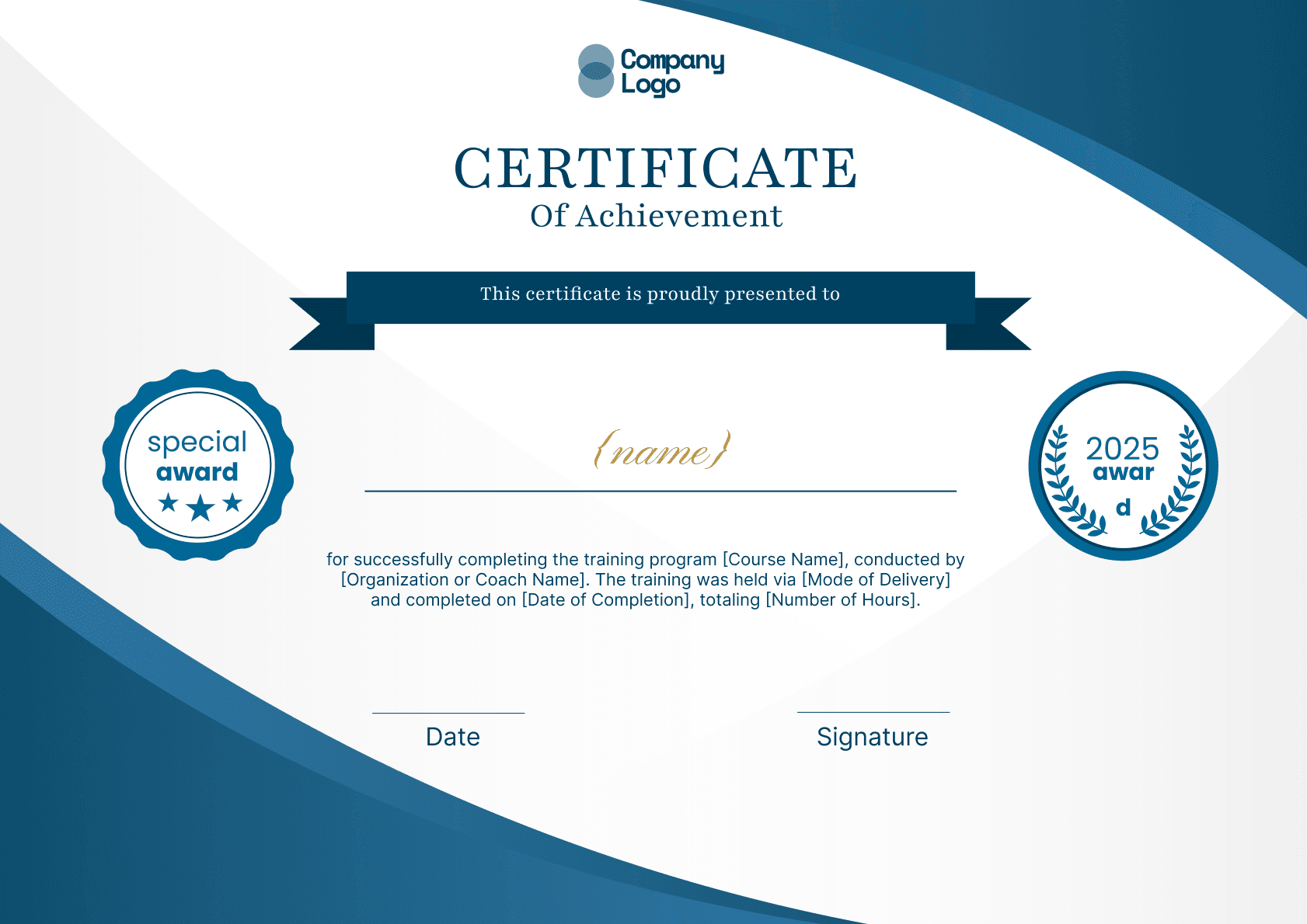 This professional portrait certificate features pink borders and elegant leaf motifs in the center. It gives a simple yet refined feel, suitable for both formal and semi-formal diploma recognitions. A QR code is included, and it also comes in blue. Fully customizable for any institution. Portrait format.