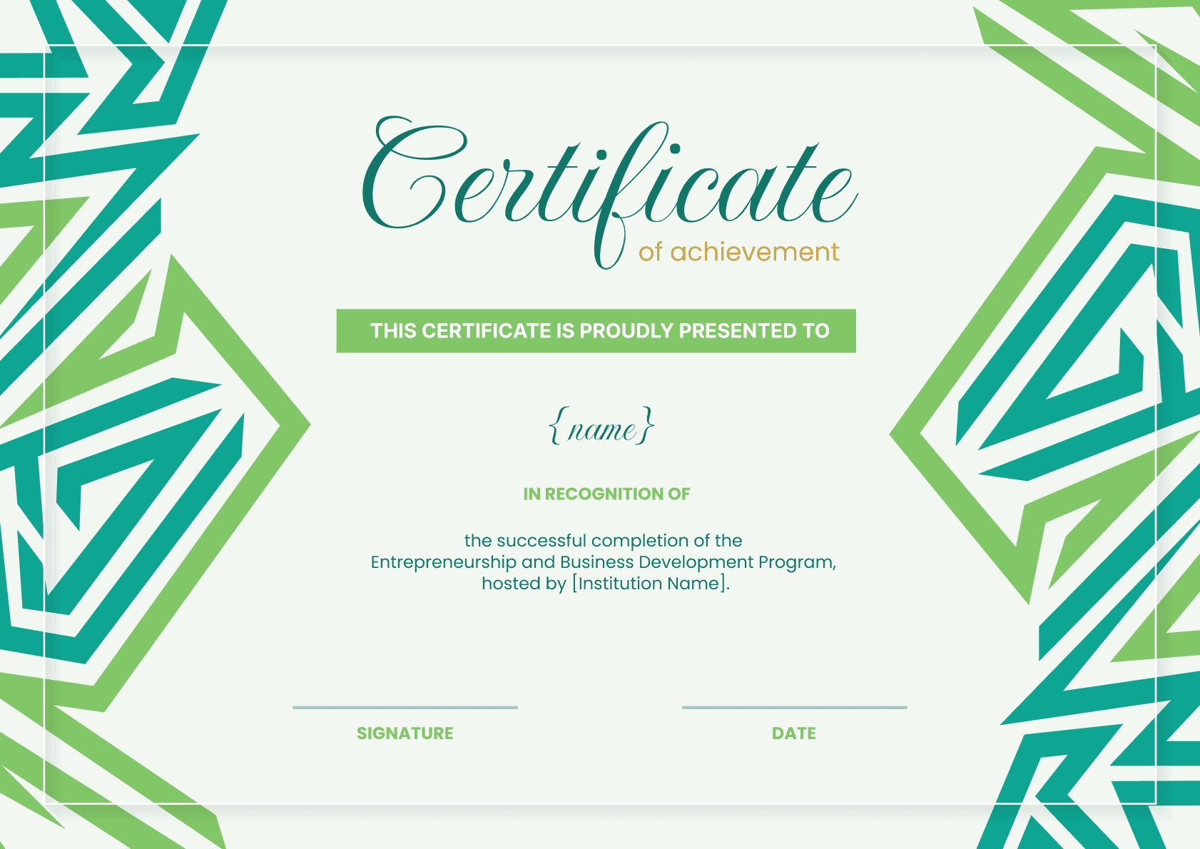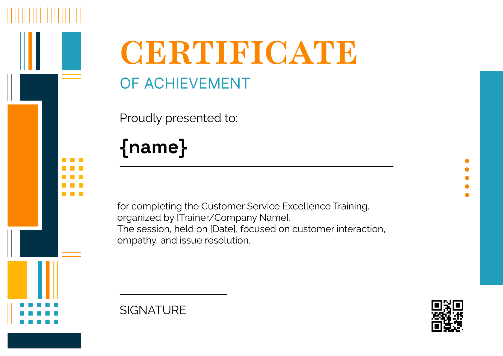 This lively and celebratory certificate template stands out with its multicolored decorative elements placed on the corners, top, and bottom. Featuring shades of green, orange, and blue against a crisp white background, it strikes the perfect balance between color and clarity. The recipient’s name is prominently displayed in a large font, drawing attention immediately and making the recognition feel special.