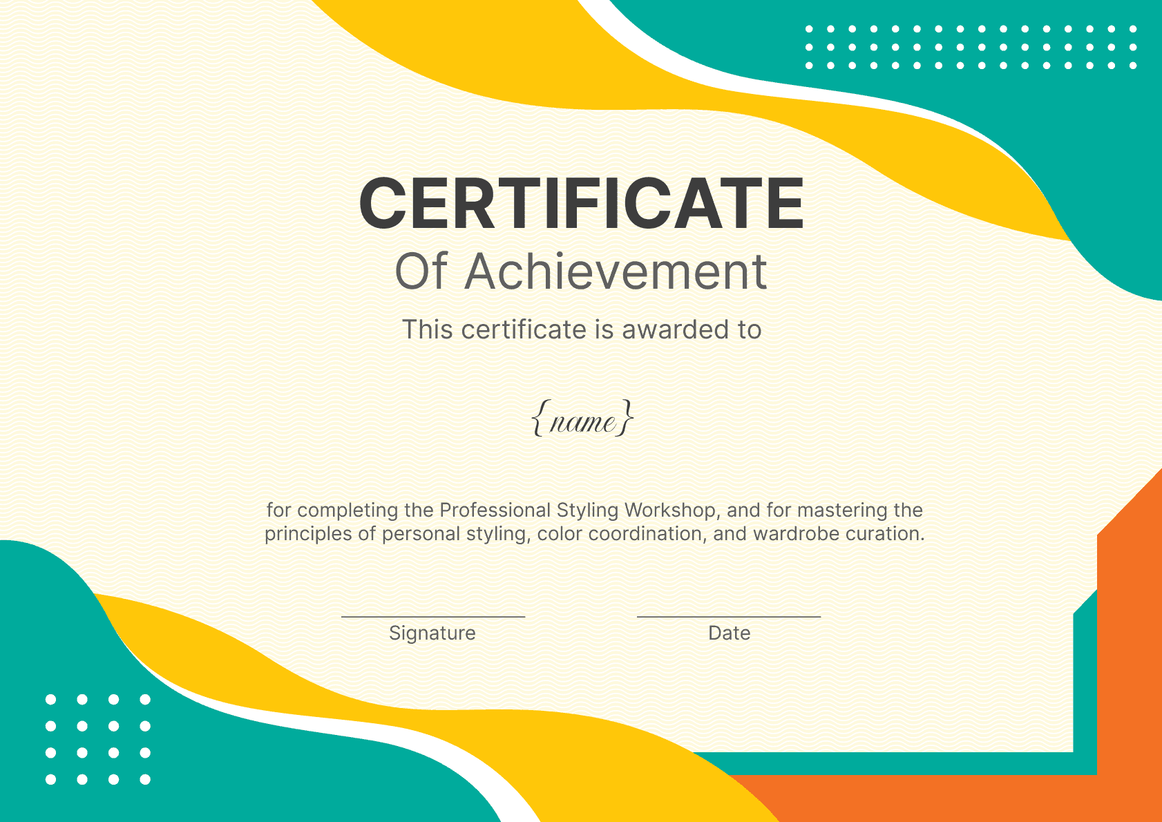 A vibrant certificate with multicolored designs in the corners and along the top and bottom. The color scheme includes green, orange, and blue, set on a white background. The name is emphasized in a large font. Fully customizable and ideal for varied recognitions. Presented in a landscape format.