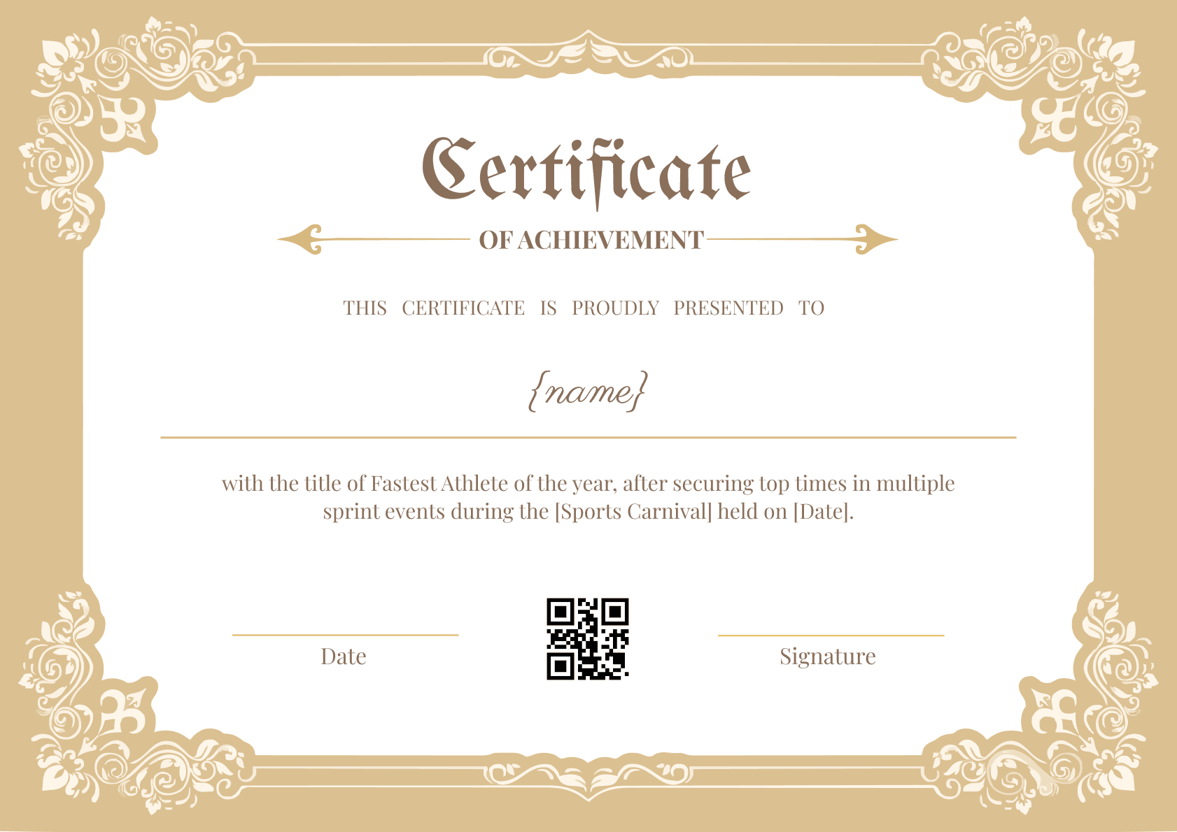 Perfectly suited for achievements across sports, academics, or corporate recognitions, this design manages to strike a balance between vibrancy and sophistication. It includes a QR code for digital validation, which helps share or archive digitally.