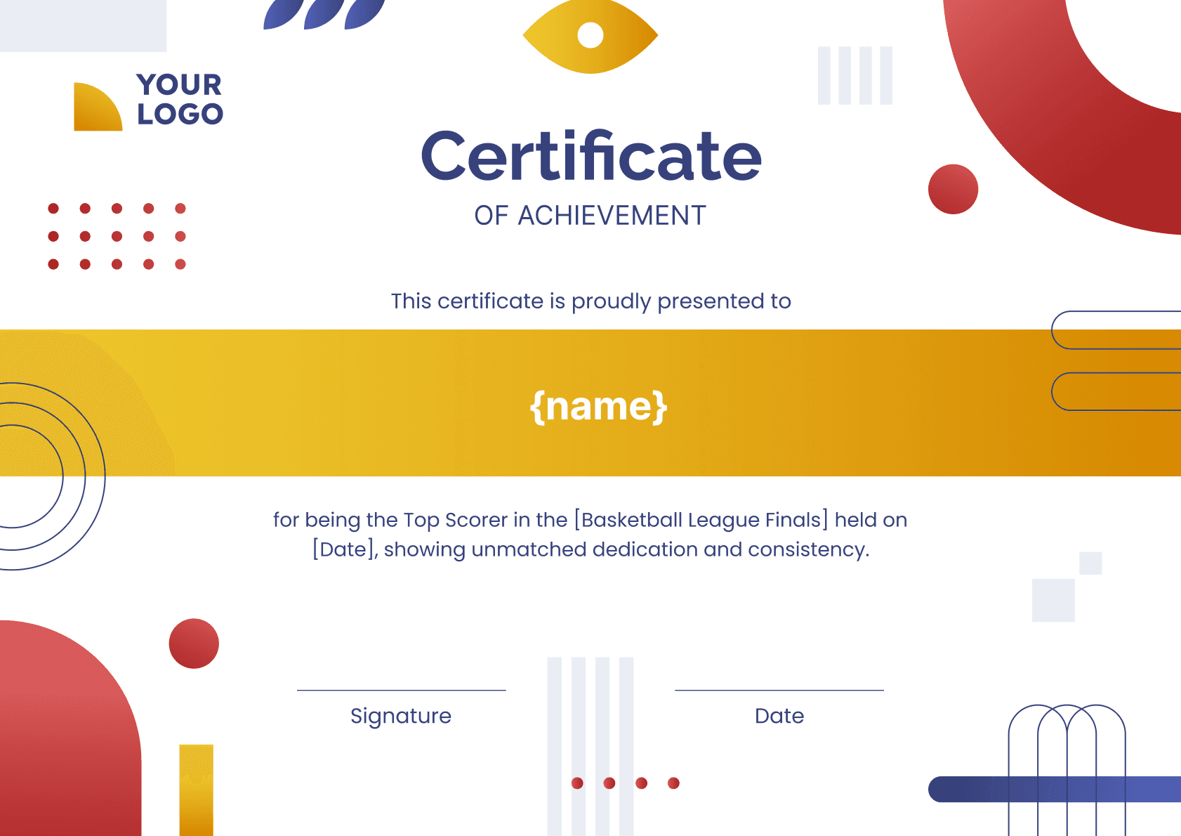 A stylish portrait-oriented certificate with diagonal wavy accents in blue, pink, and yellow. Featuring a central badge with a star encircled by laurel leaves, it’s perfect for recognizing achievements in sports or informal settings. The recipient’s name is bold, and the layout is clean and highly customizable.