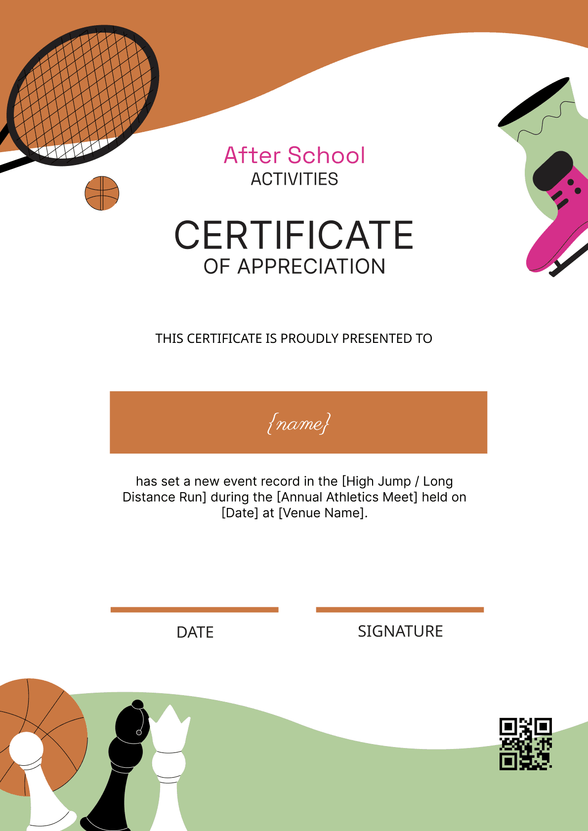 The recipient’s name is boldly highlighted, giving it center-stage prominence, while the rest of the layout is neatly structured for easy reading. A QR code section is included for digital tracking, verification, or access to additional award details or resources.