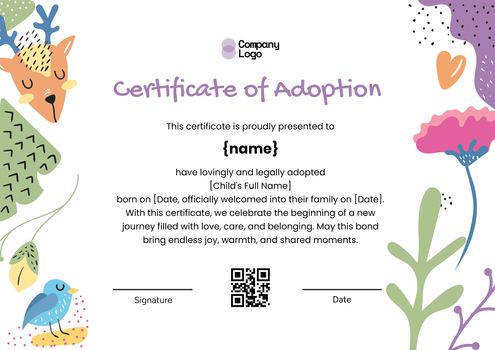 Celebrate a peaceful and loving transition with this "Serene Adoption Celebration" certificate template. The design embraces a calming, soft pastel aesthetic with flowing shapes in shades of pink, beige, and yellow. Delicate floral silhouettes, falling leaves, and charming string lights delicately frame the customized text. The elegant pink typography perfectly matches the gentle and heartwarming tone of the document. This highly elegant template is an excellent choice for infant adoptions, private adoption agencies, and families seeking a soft, beautiful keepsake to commemorate the day their hearts became whole.