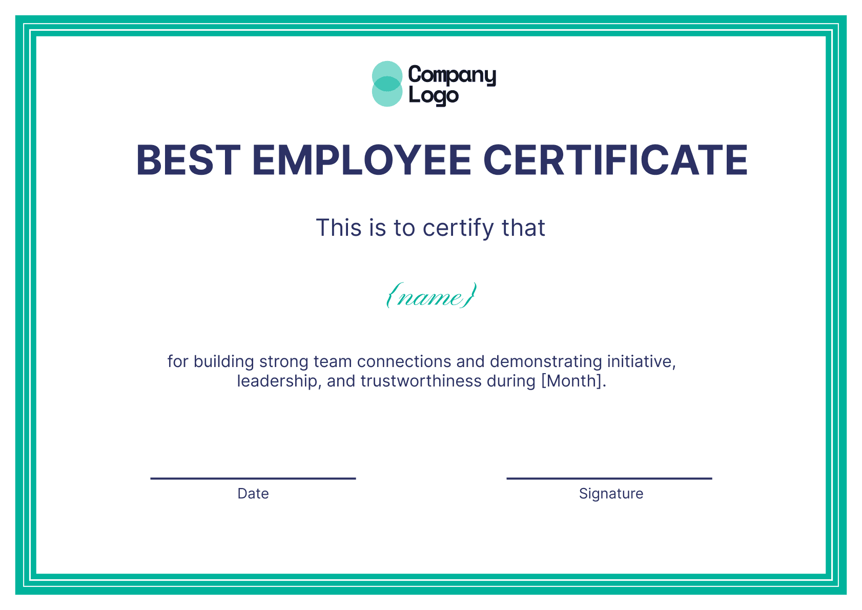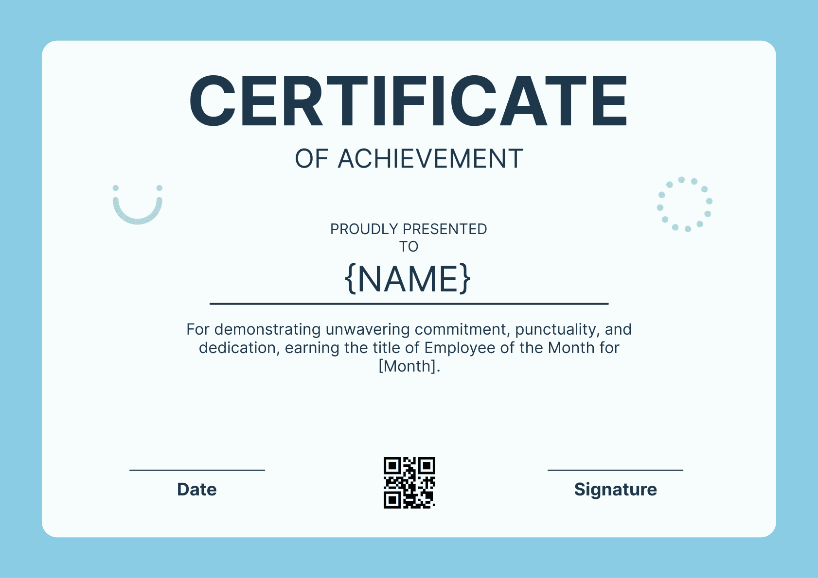 A formal portrait certificate with a blue border and light blue background. Smiley and dotted circular designs on both sides add a unique touch. QR code available. Ideal for all types of professional recognition, not just best employee. Fully customizable. A landscape version of the certificate is also available.