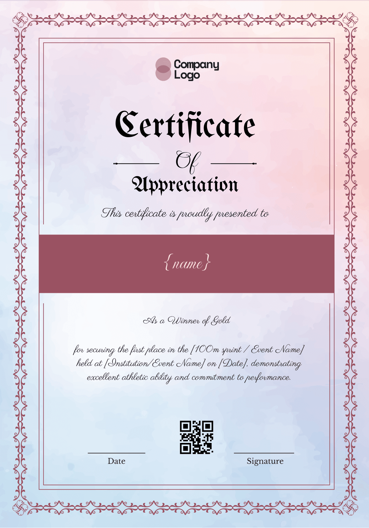 This certificate template brings a dignified and traditional aesthetic. Thick borders in navy, maroon, and brown feature ornamental motifs that evoke a sense of heritage. The recipient’s name is centrally displayed in striking golden font, drawing attention to the achievement being recognized.