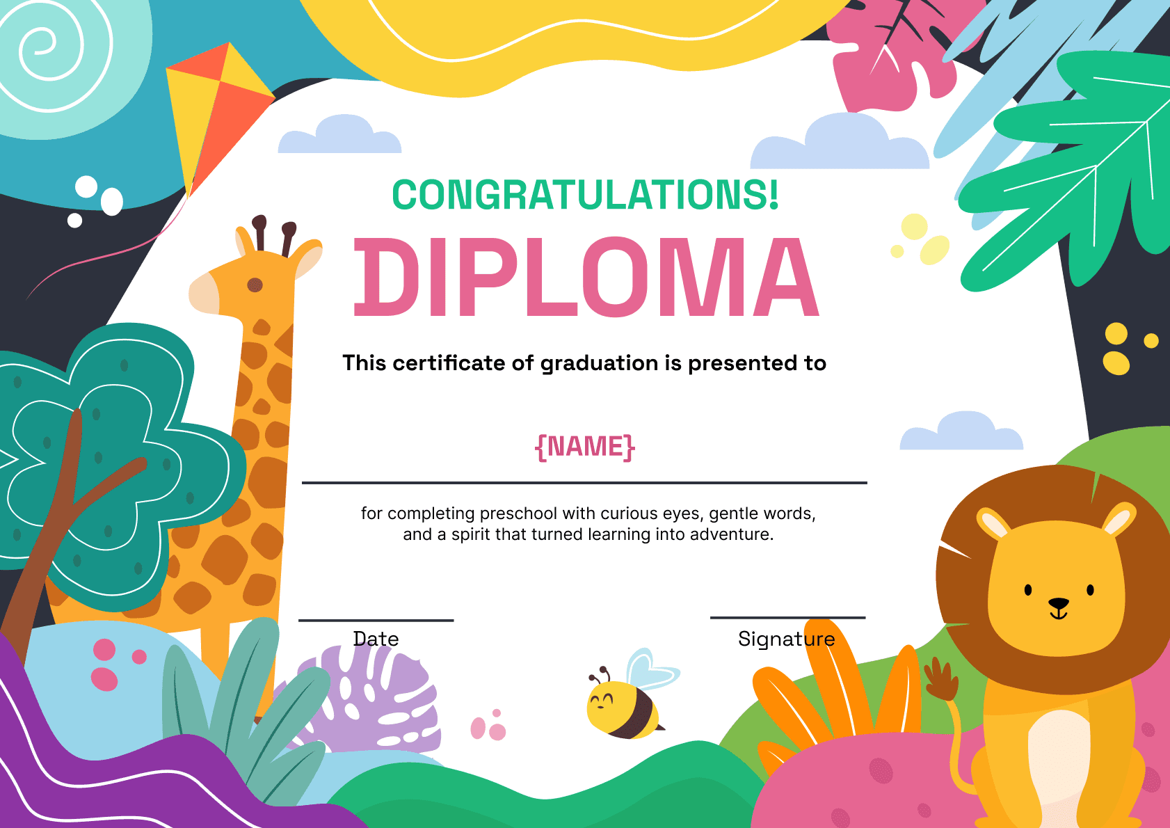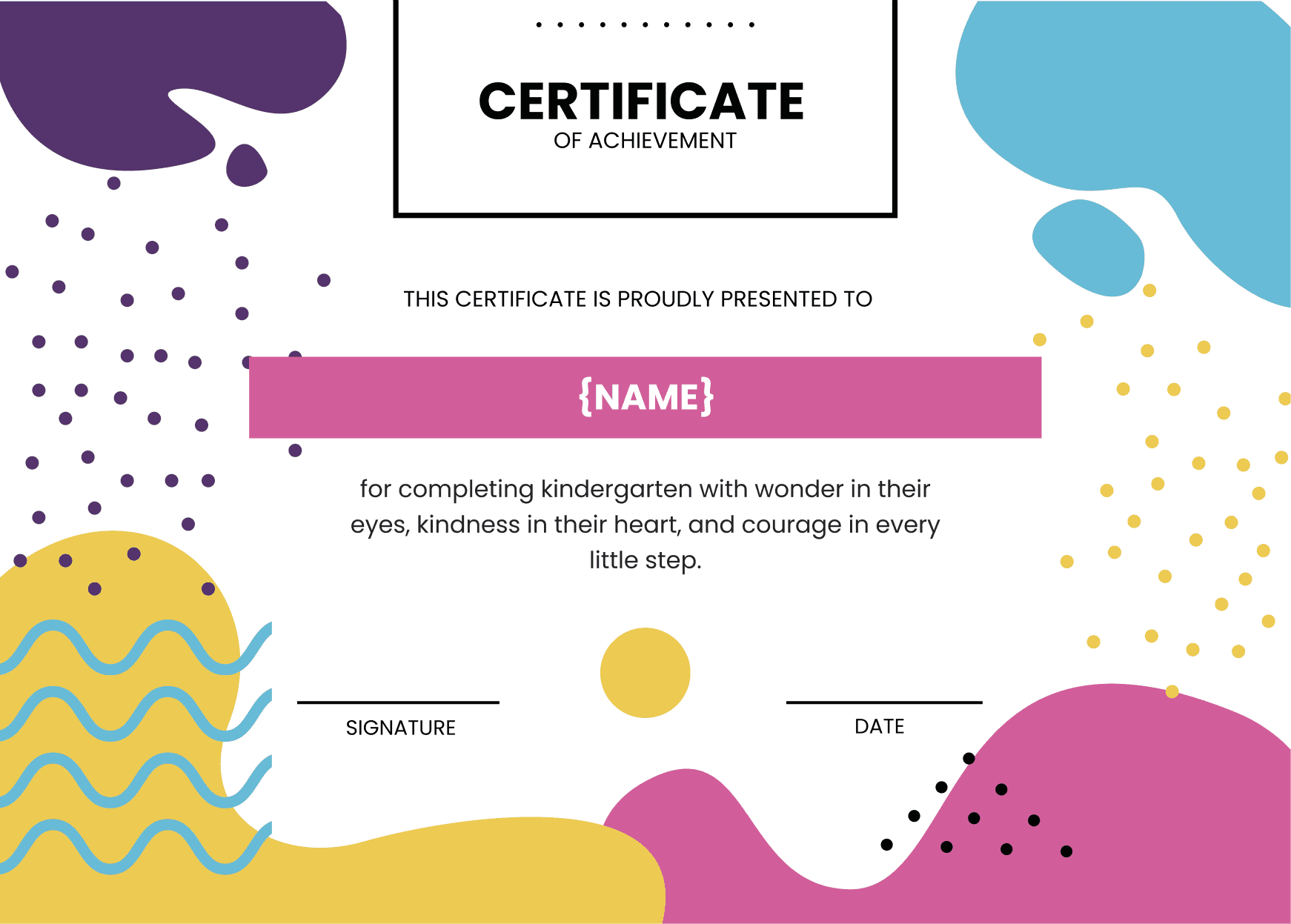 This diploma certificate radiates fun and creativity, featuring curvy, wavy side elements in pink, purple, and yellow. It’s the perfect layout for creative institutions, youth workshops, or informal diploma events that aim to recognize learning in a lighthearted, stylish manner.